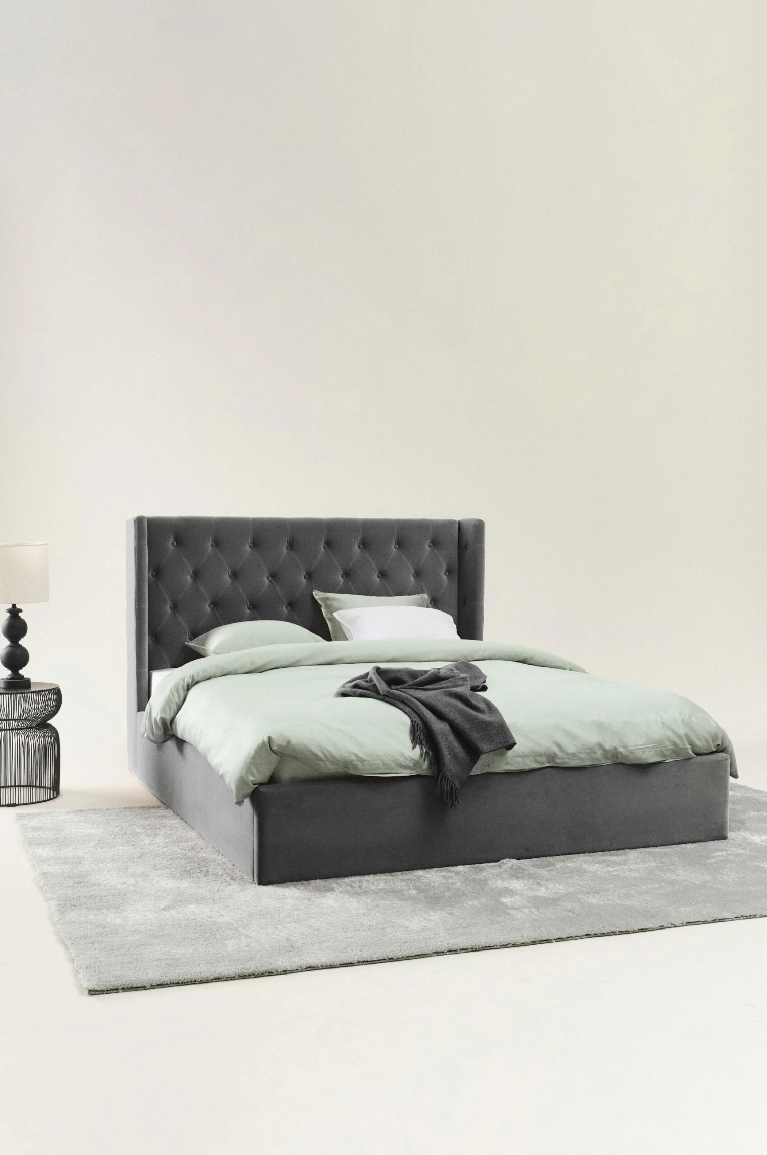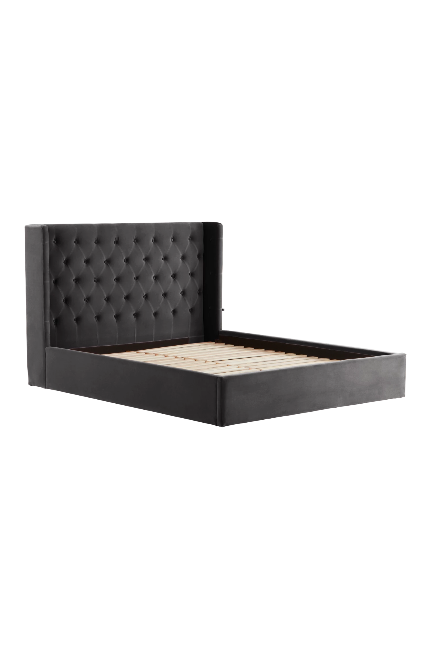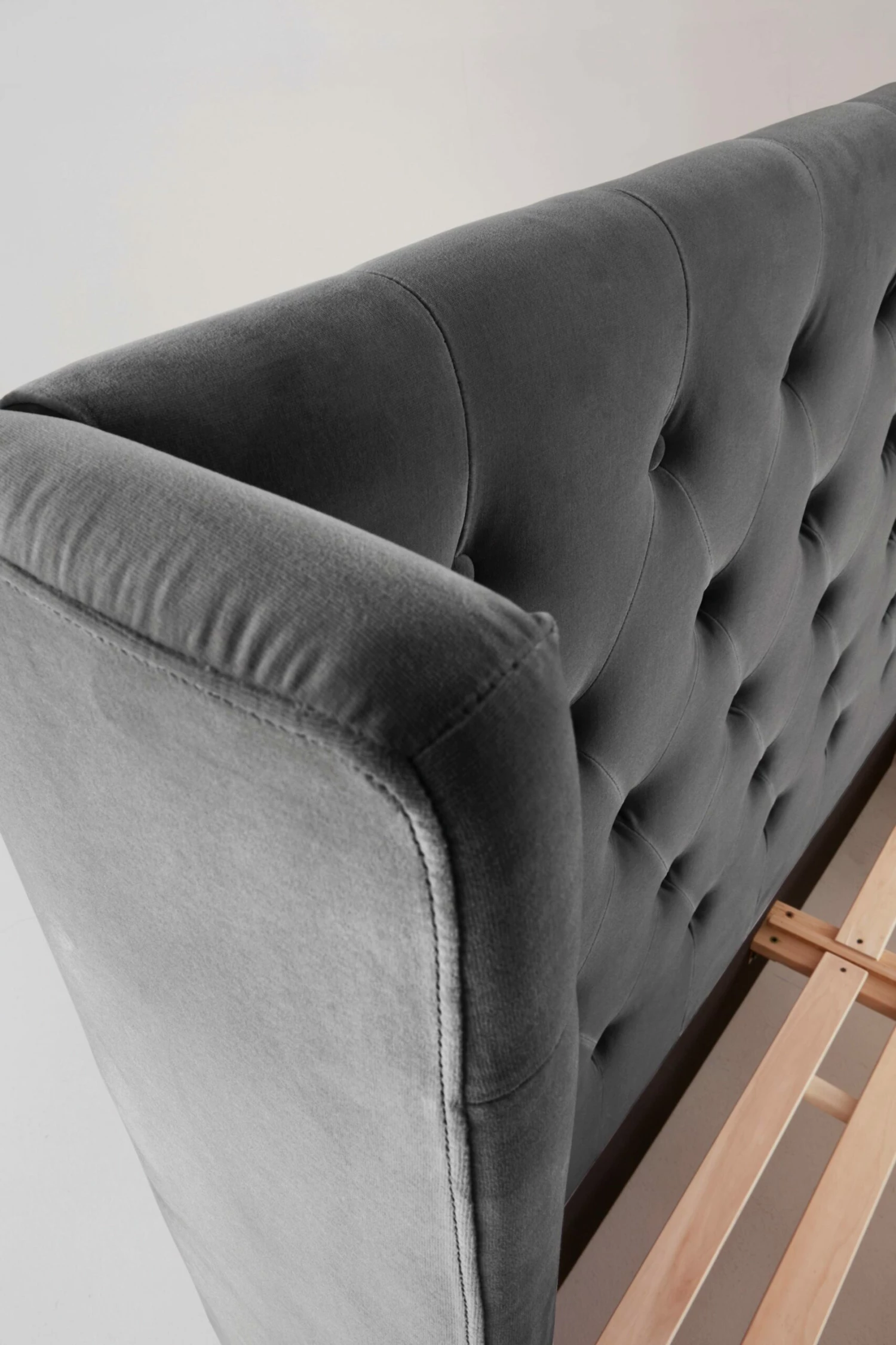 Sängram klädd i vackert sammetstyg med mjuk vaddering. Huvudgaveln har dekorativa, djuphäftade, klädda knappar och vinge på vardera sidan skapar mysig inramning. Sidorna och fotgaveln är stilrent släta och ramen runt sängen går nästan ända ned till golvet, bara en liten luftspalt lämnas som gör att luften kan cirkulera under sängen. Sängramen har ribbotten av furu och du kompletterar med madrasser eller resårmadrasser beroende på vilket du föredr…