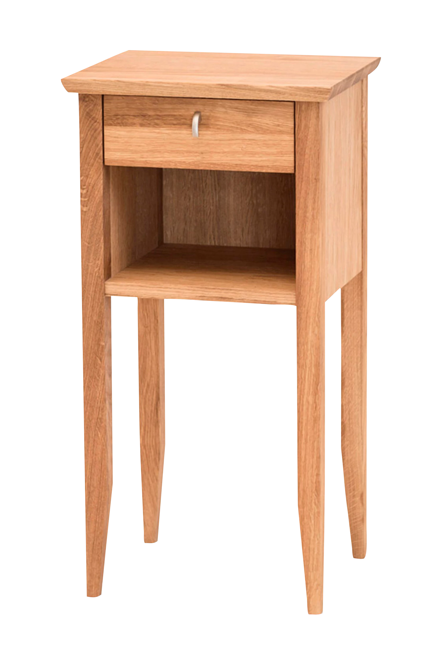 Sängbord med hylla och låda. Bredd 39 cm. Djup 32 cm. Höjd 76 cm. Vikt 9 kg. Monterad