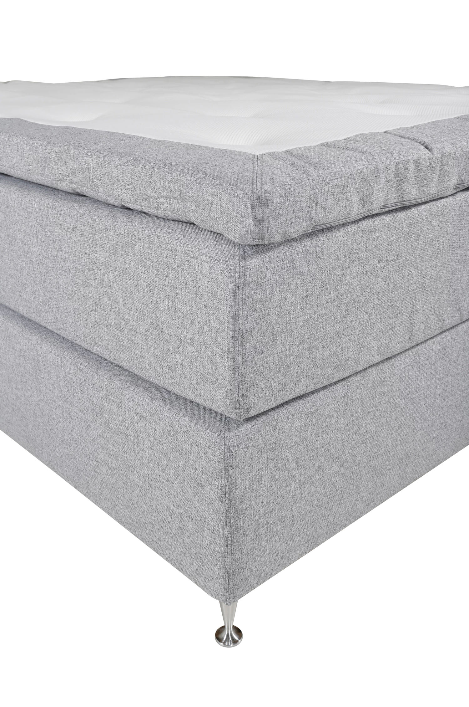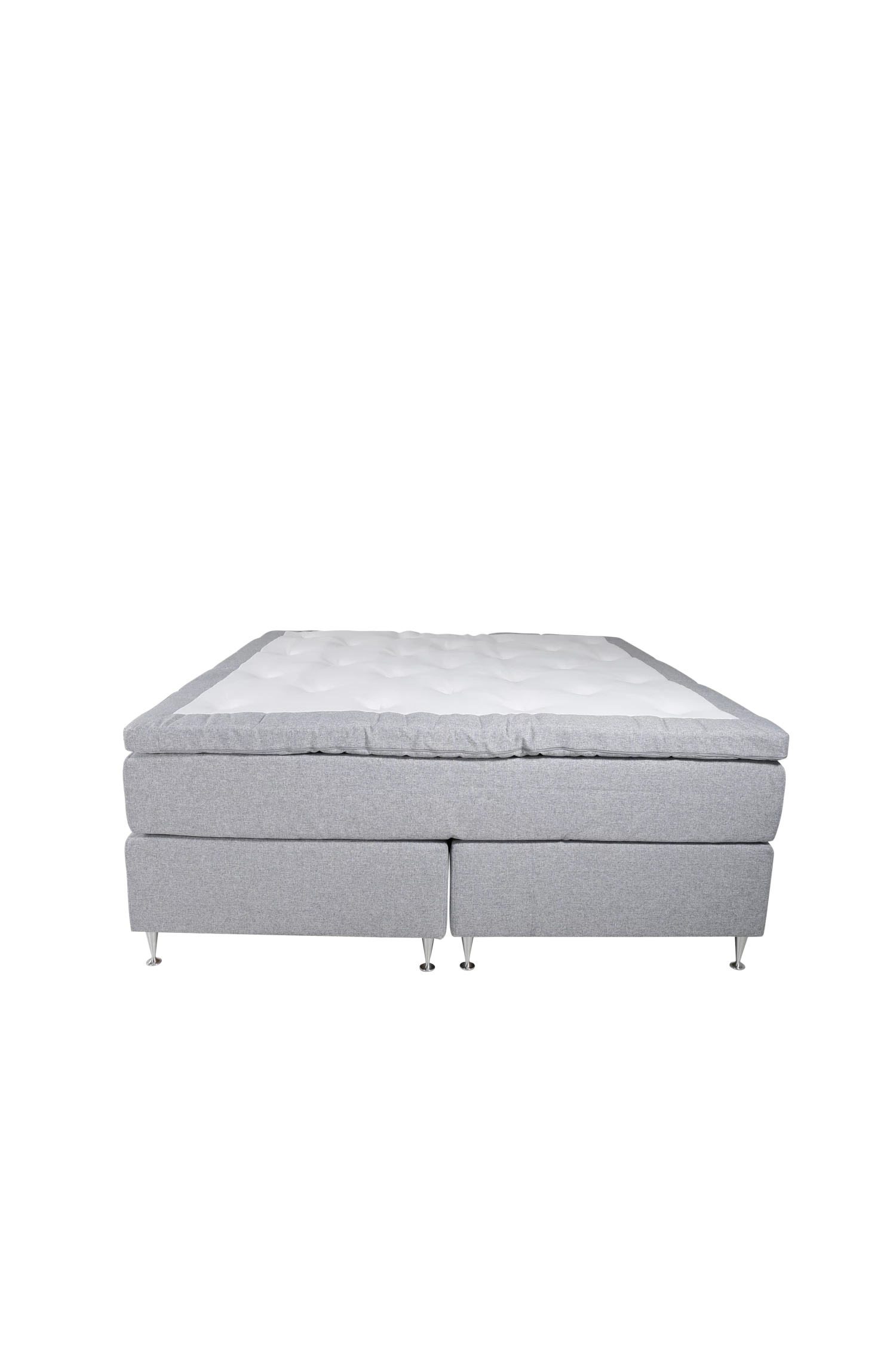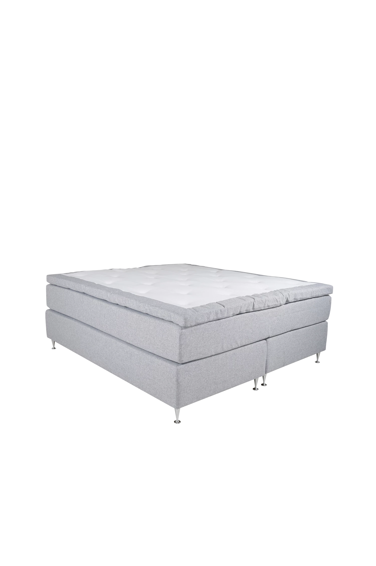 Fjärås, en modern lyxig kontinentalsäng i ett slitstarkt polyestertyg och Medium hårdhet som kommer med ett dubbelt pocketresårsystem. En säng som kommer ge ett maffigt och lyxigt intryck till sovrummet med sin höga höjd och många madrasser, uppbyggd i 3 lager för att ge en god sömn. Sängbotten är uppbyggd av en massiv träram i gran med ett fjädersystem i pocket som hjälper till att ge dig rätt avlastning och stöd för hela kroppen. Resårmadrassen är uppbyggd av pocketfjädrar med 7 komfortzoner som är anpassade för att ge maximal avlastning när du sover vare sig du sover på mage, rygg eller sidan. Den pikerade bäddmadrassen är uppbyggd av mickrofibervadd och kallskum som kommer ge dig extra följsamhet. Sammantaget är sängen uppbyggd för att ge en extra skönt sovkomfort som möjligt samt ge ett enhetligt intryck i sin helklädda design. Hela sängen vilar på champangeben i silvrig aluminium. Lättare montering krävs. 10 år på ram och fjäder brott. Sänggavel kan köpas till separat.