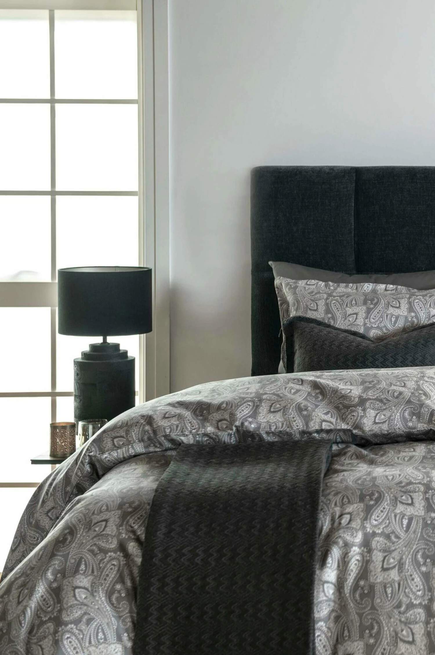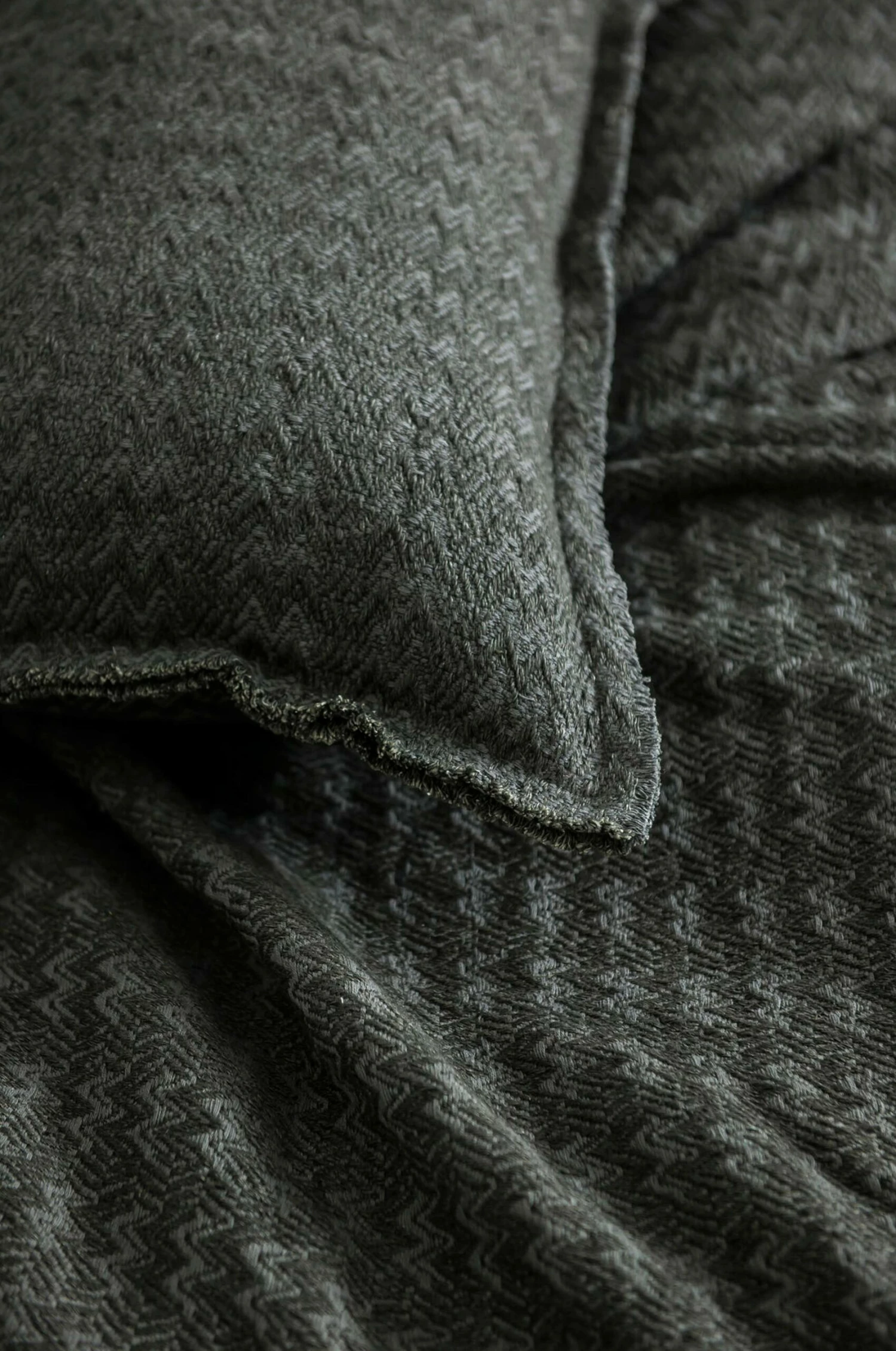 Snyggt sängöverkast i 100 % lin som är vävt i ett fiskbensmönster. Det faller fint på sängen och tillsammans med matchande kuddfodral är resultatet än mer stilfullt.
