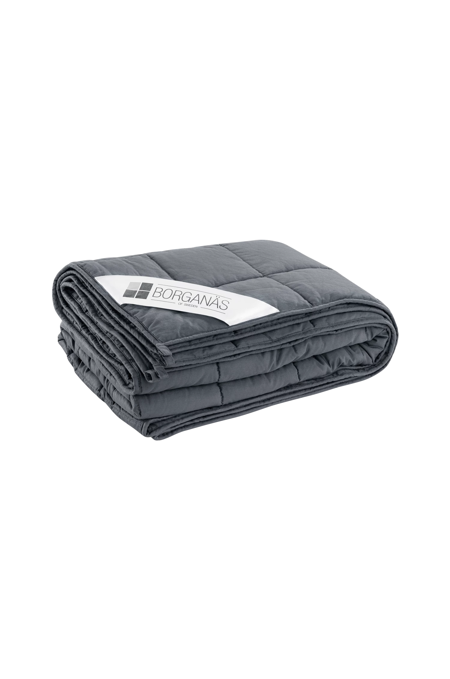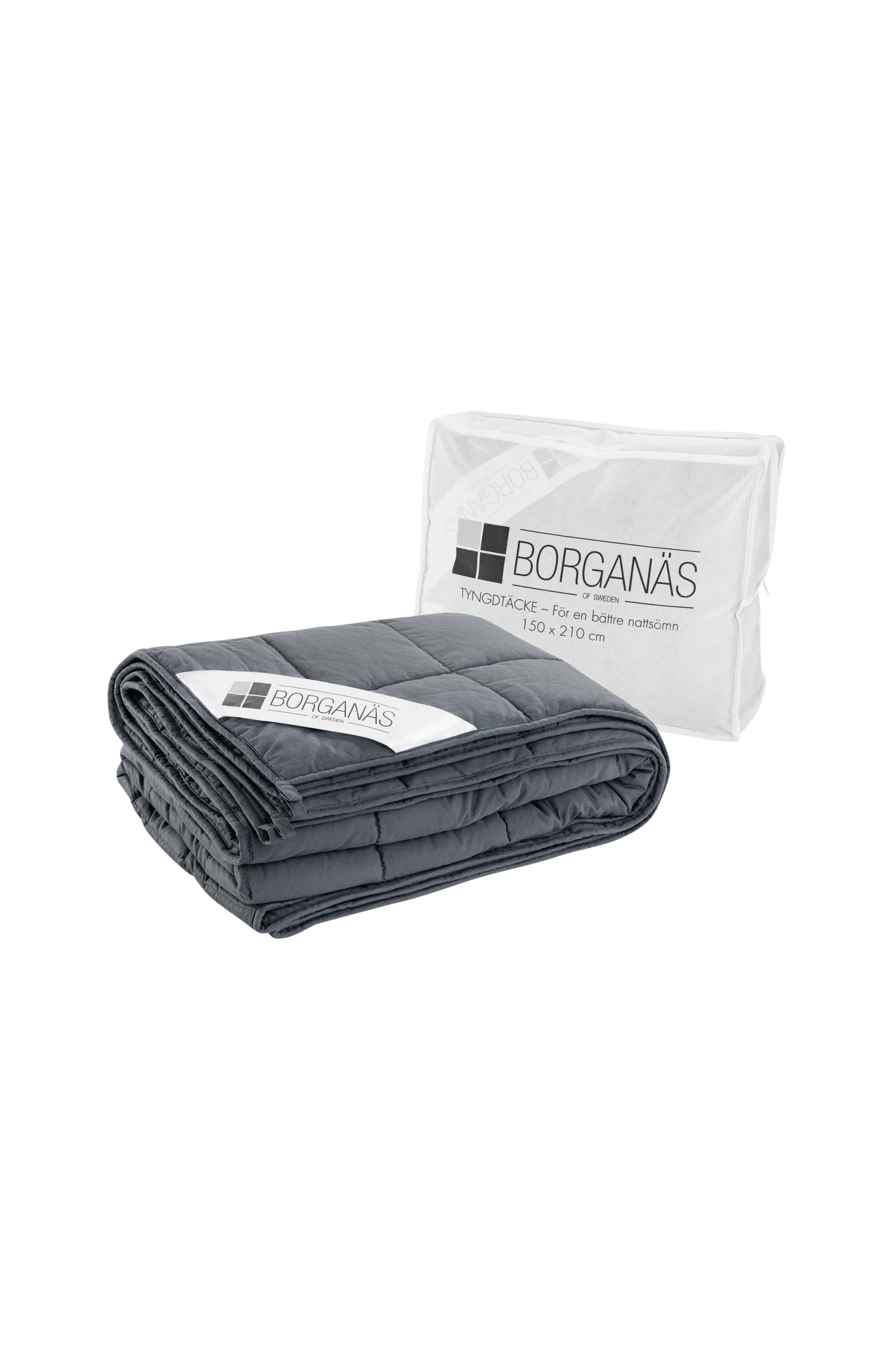 Tyngdtäcke tillverkat i bomull med polyesterfyllning. Borganäs tyngdäcke fördelar vikten jämt över kroppen och ger en omslutande känsla. Täcket är quiltat och finns i flera varianter. För att uppnå bästa komfort välj ett täcke som motsvarar ca 10–15% av kroppsvikten. Tyngdtäcket levereras i praktisk väska.OEKO-TEX. Tyg 100% Bomull. Fyllning av polyester och 7 400 g kiselpärlor