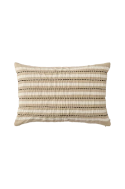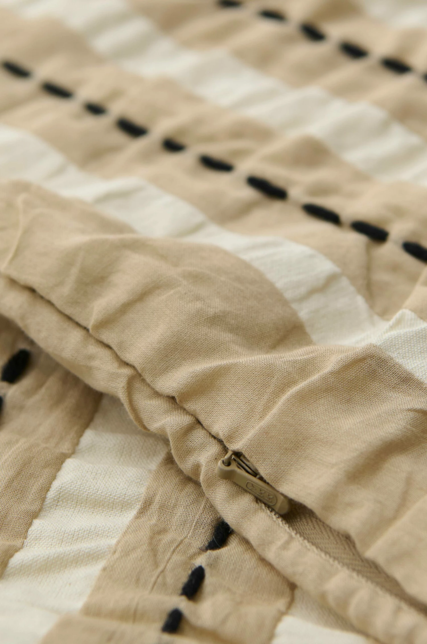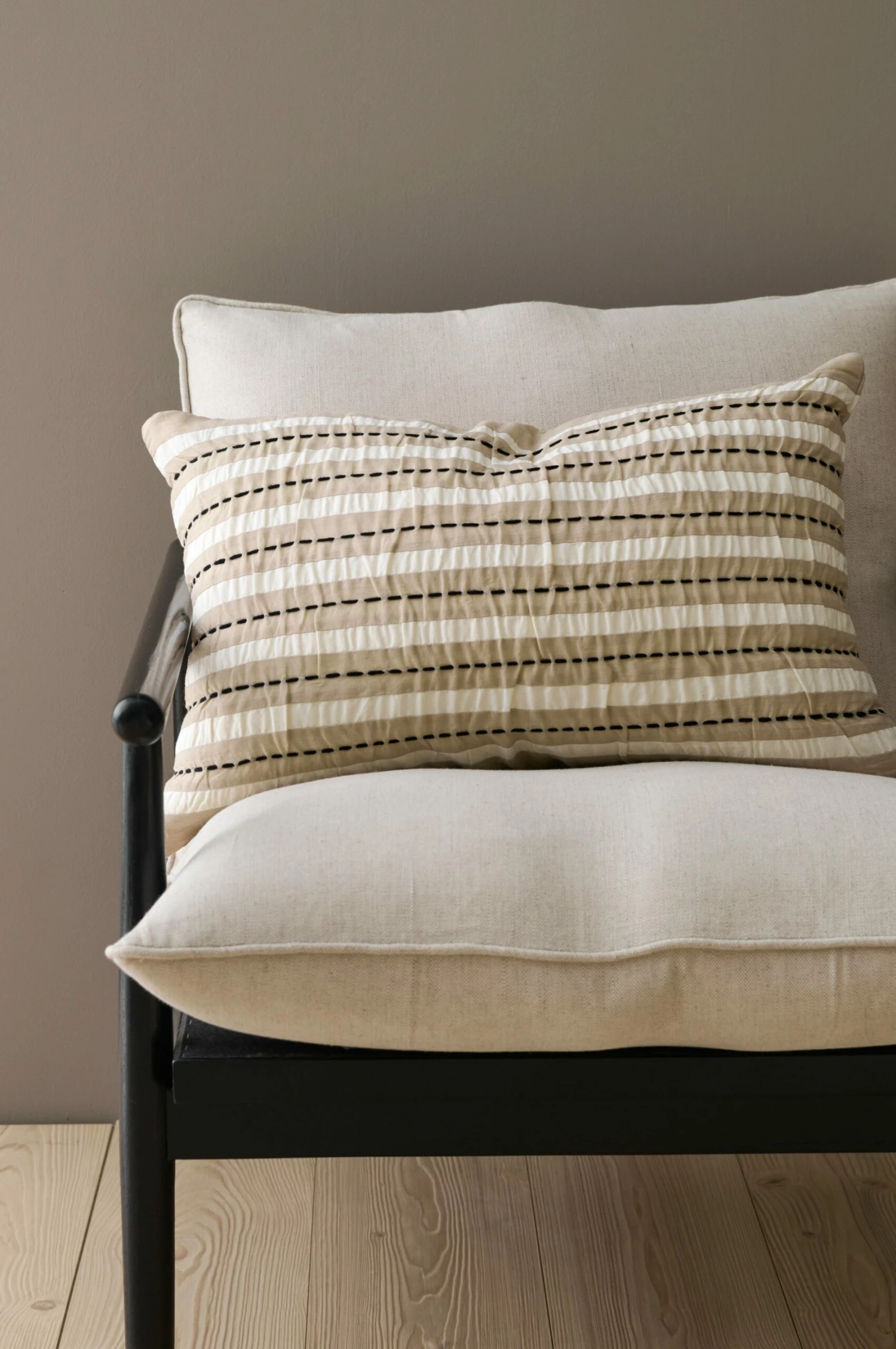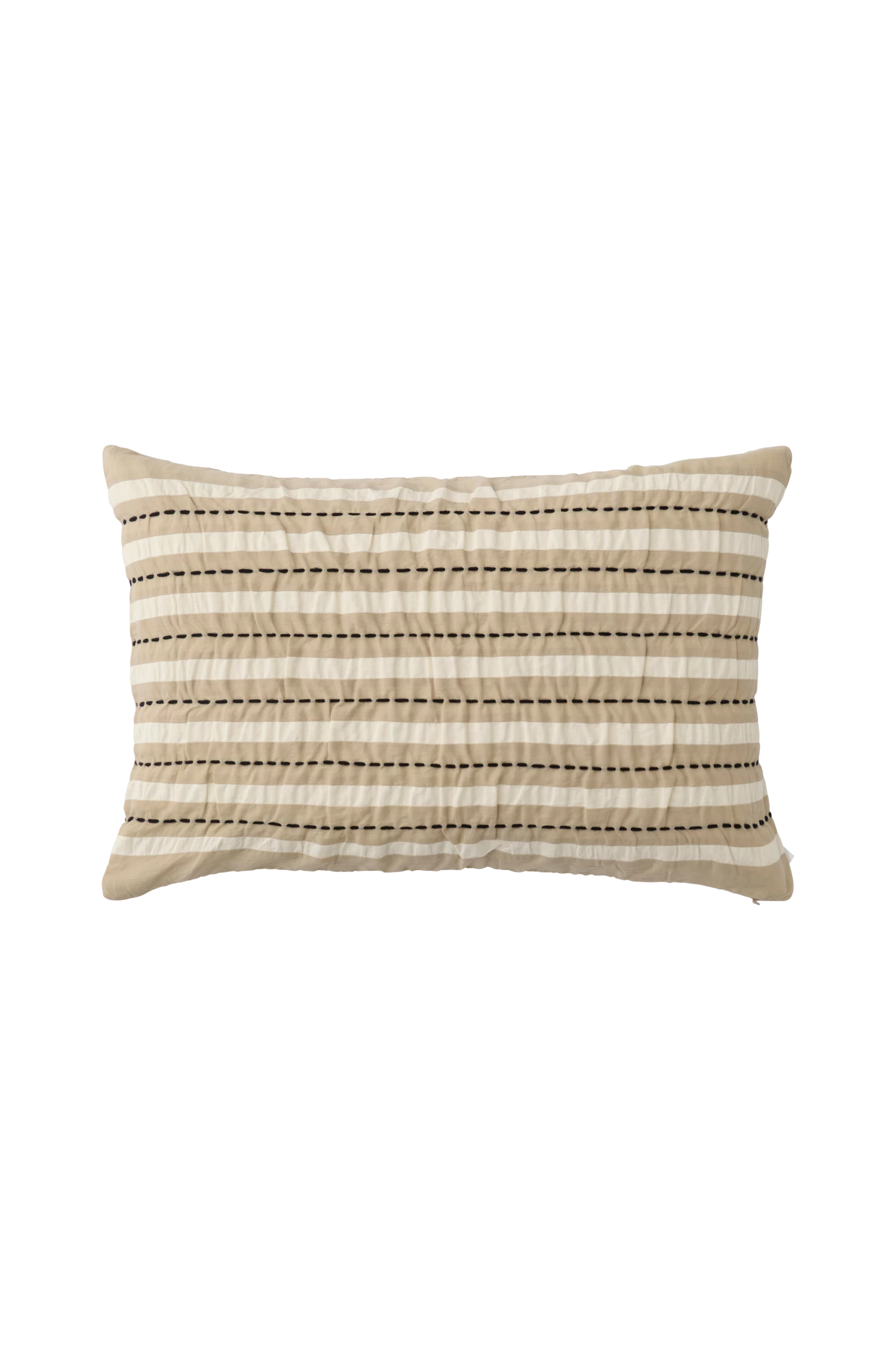 Kuddfodral i bomull med handsydda stygn och ränder i seersucker (bäckebölja) med struktur i tyget. Dragkedja i botten.