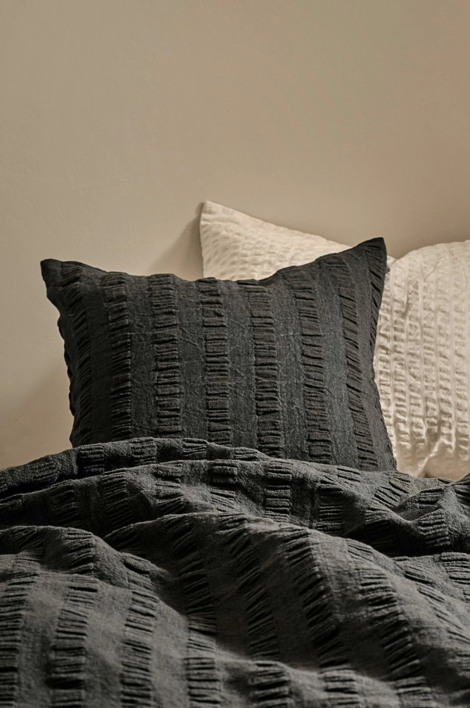 Kuddfodral i bäckebölja (seersucker) av lin och bomull i kraftig kvalitet med klassiskt strukturmönster. Dragkedja. Stl 50×50 cm.
