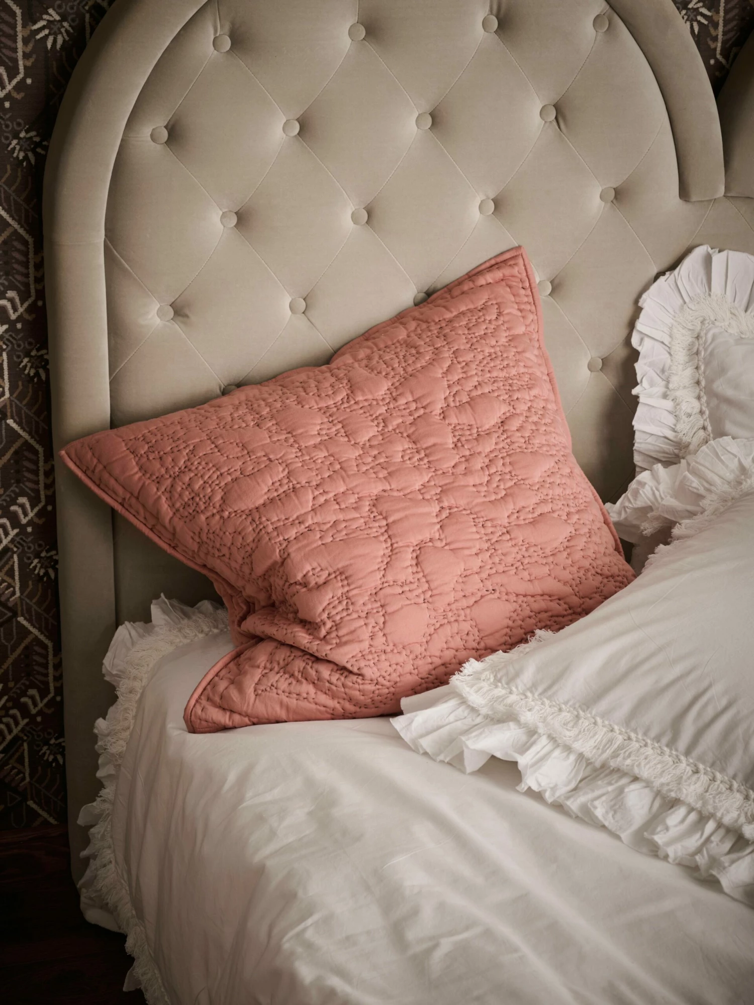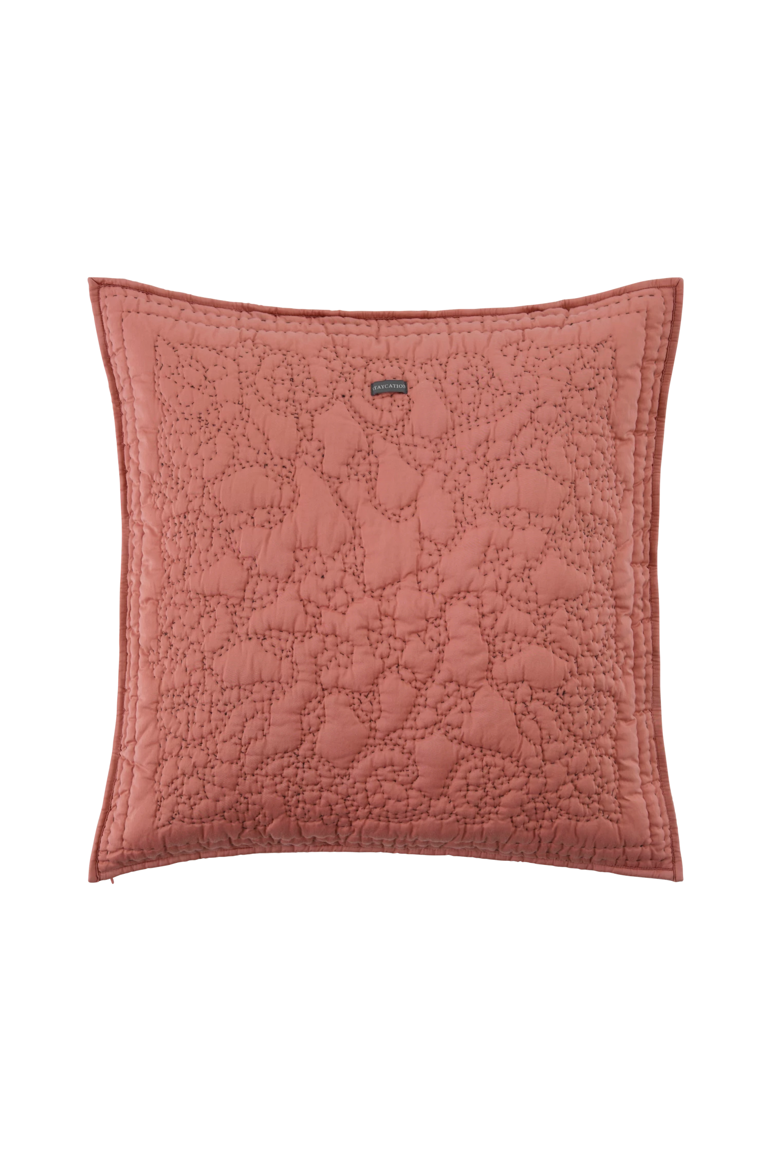 Kuddfodral i tvättad och handquiltad bomullssatin på både fram- och baksida. Broderat mönster och bård runt om. Dragkedja. Fyllning av polyester (180 g). Stl 65×65 cm.