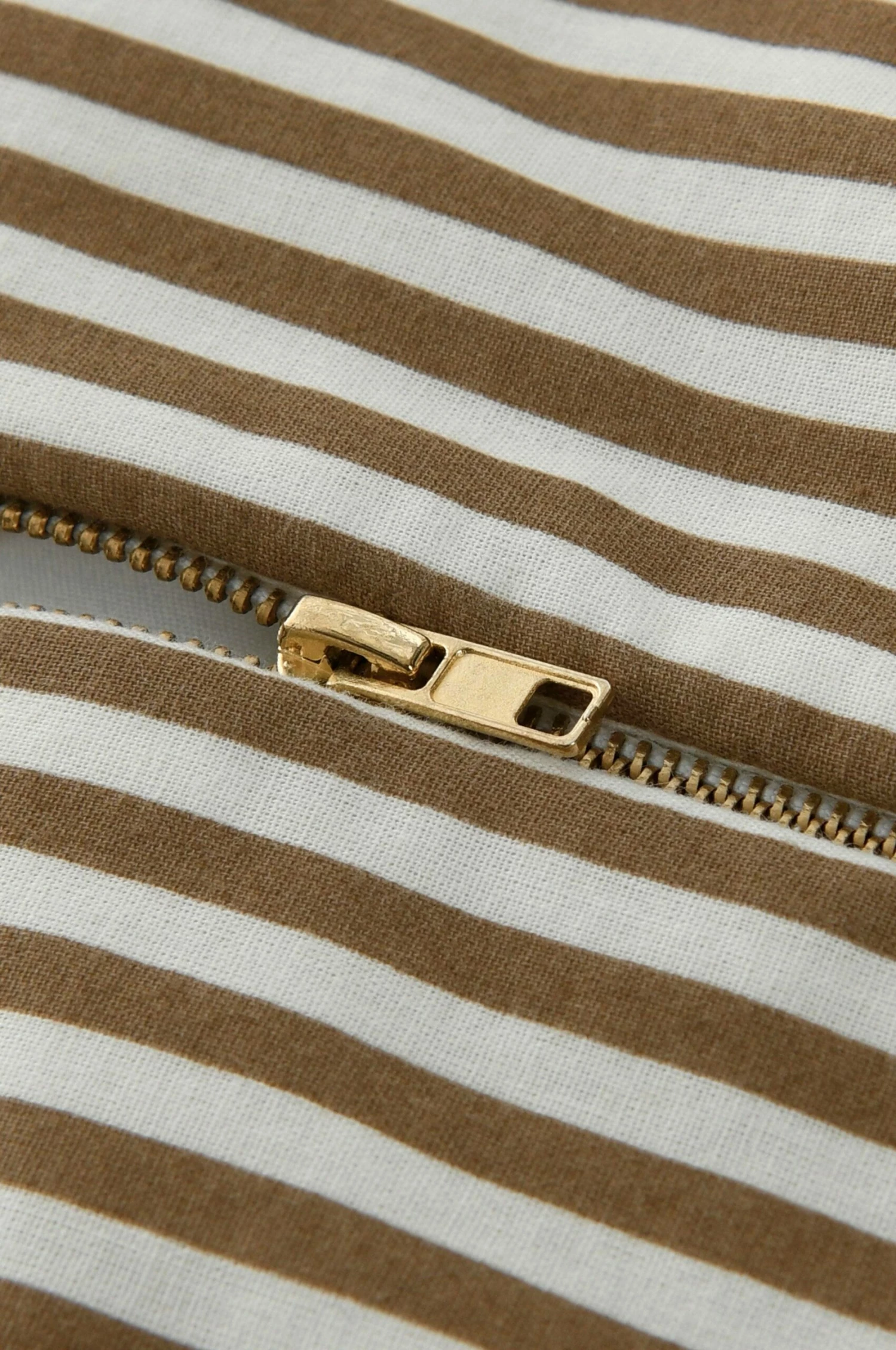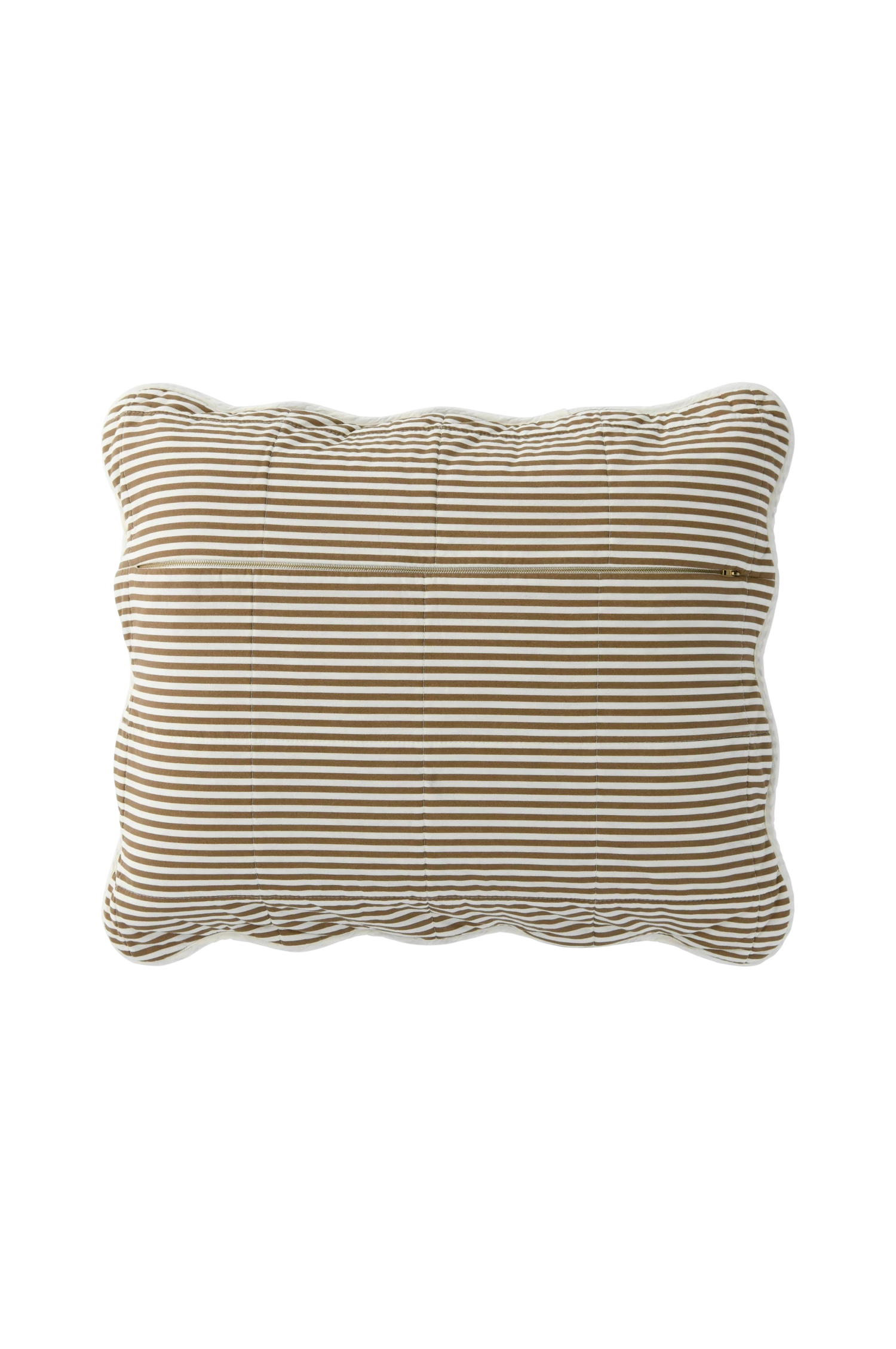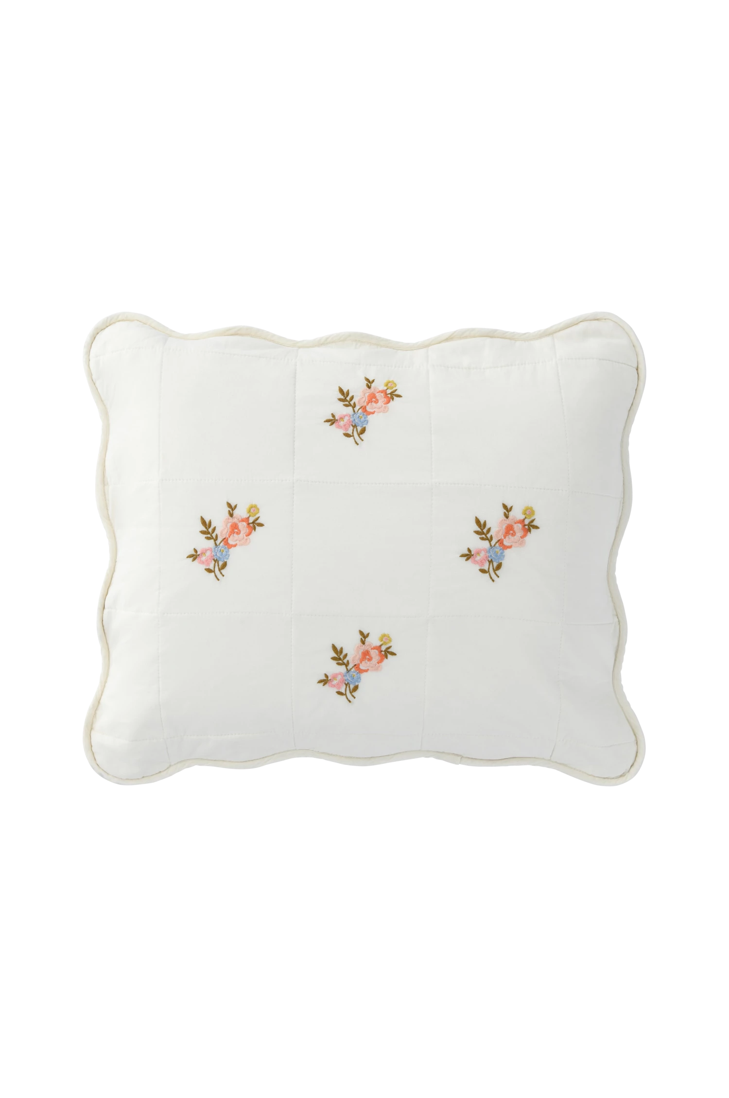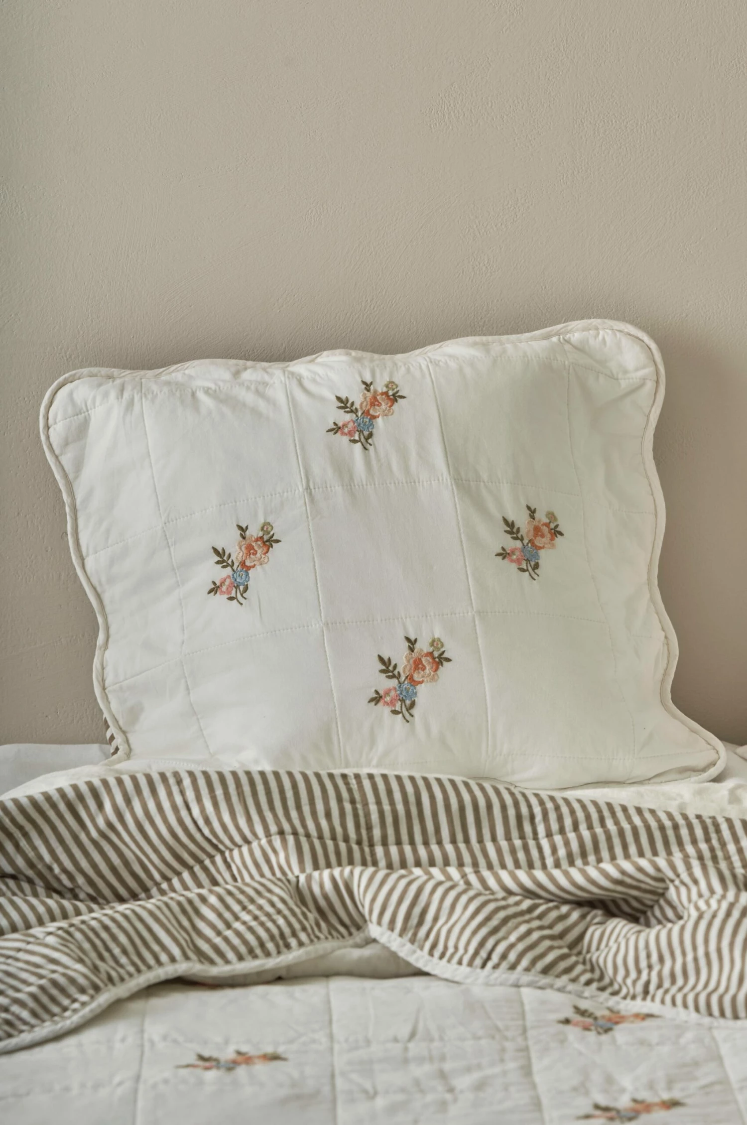 Quiltat kuddfodral i tvättad bomull med bågade kanter runt om. Den ena sidan har broderade blommor och den andra sidan är randig.