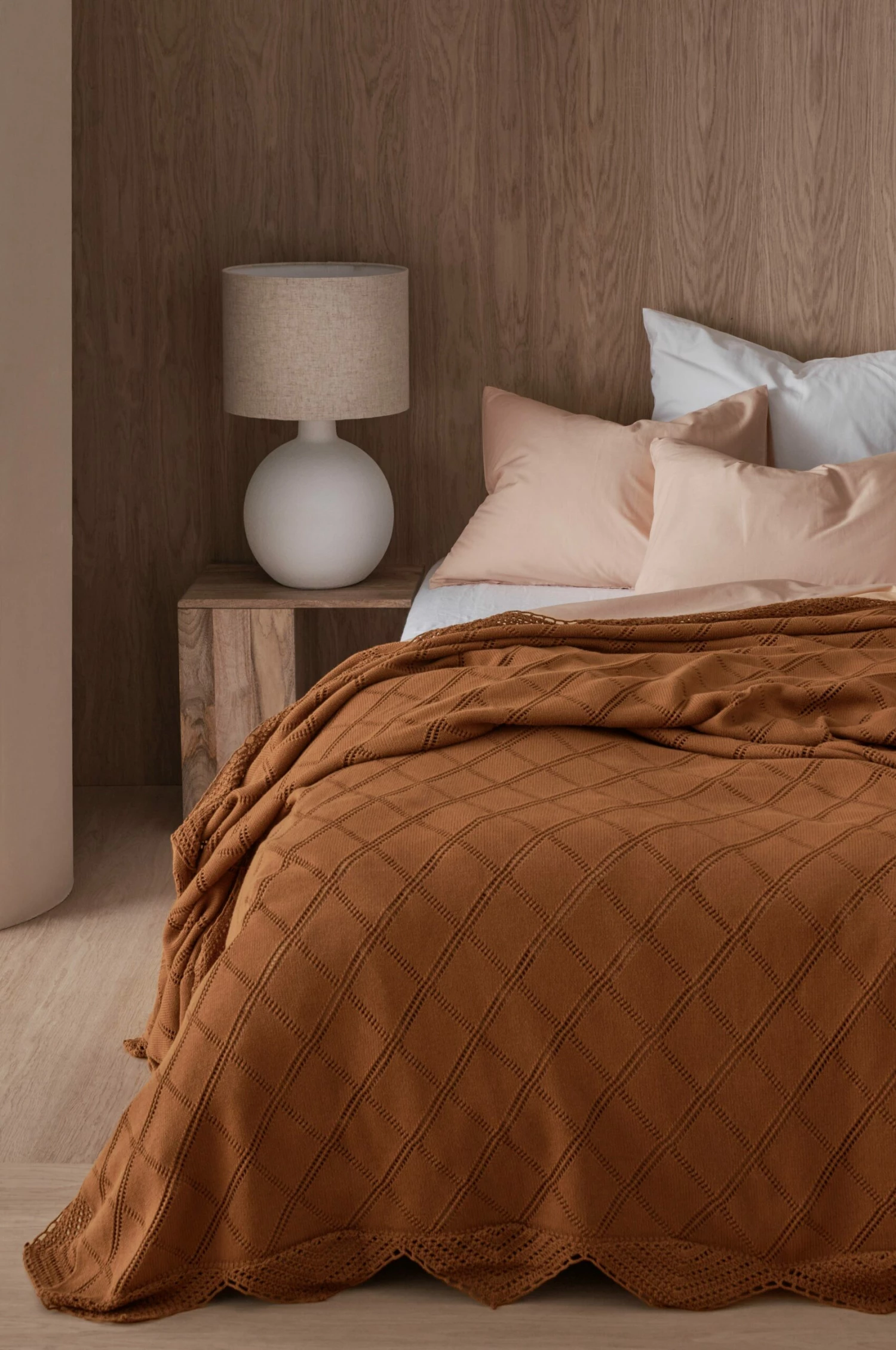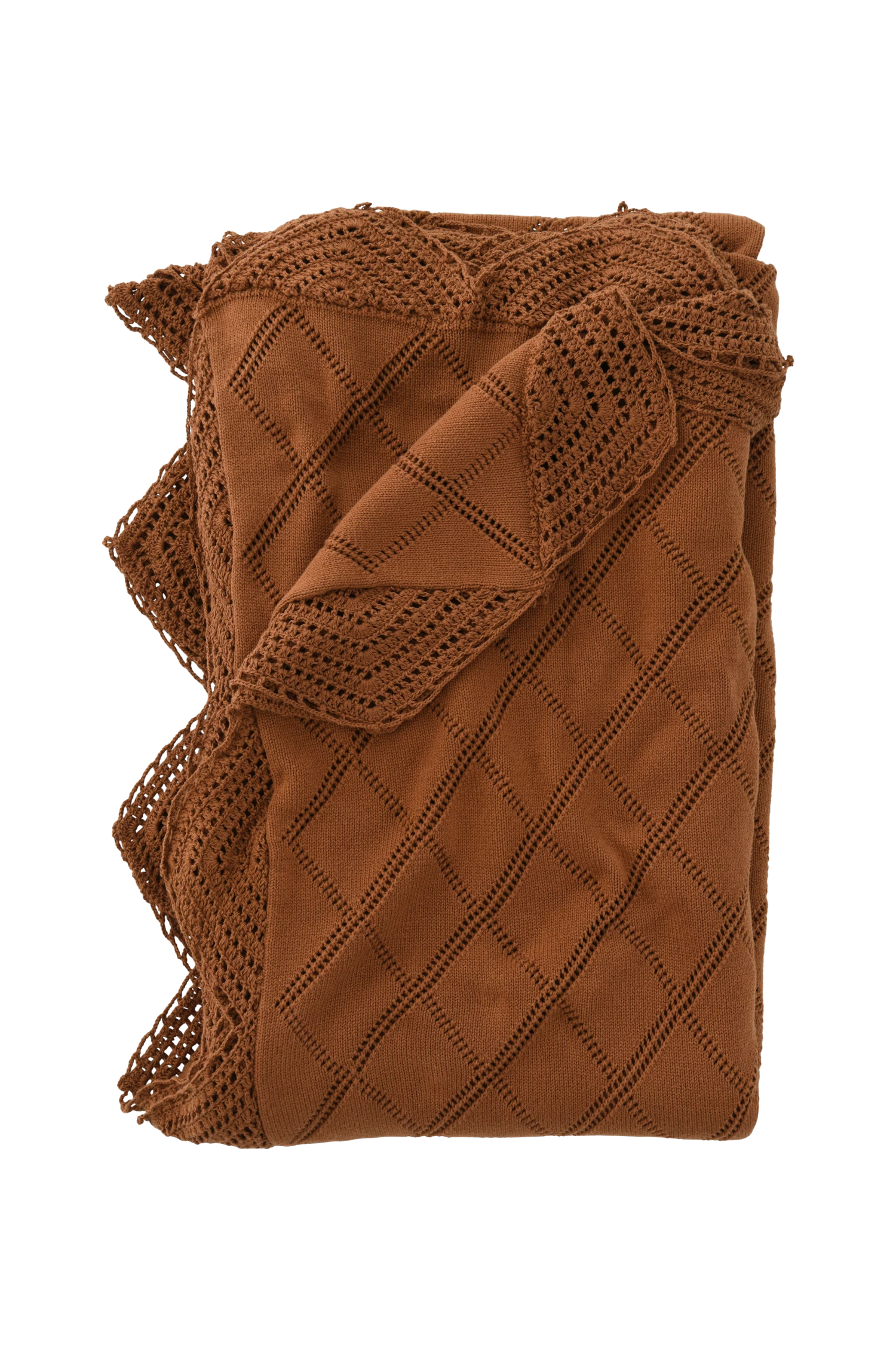 Stickat överkast i tvättad bomullskvalitet med virkad kant runt om och broderat mönster.