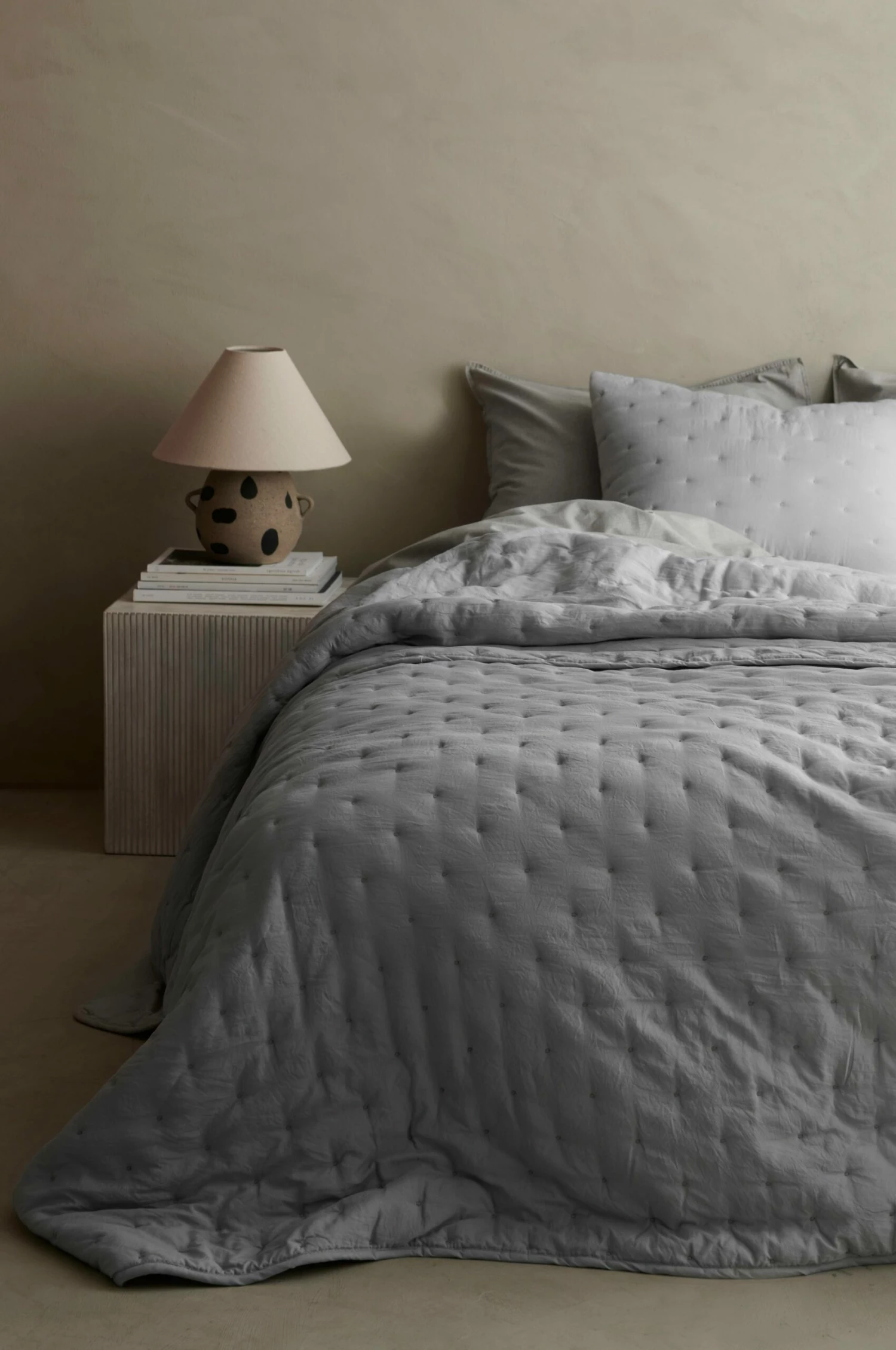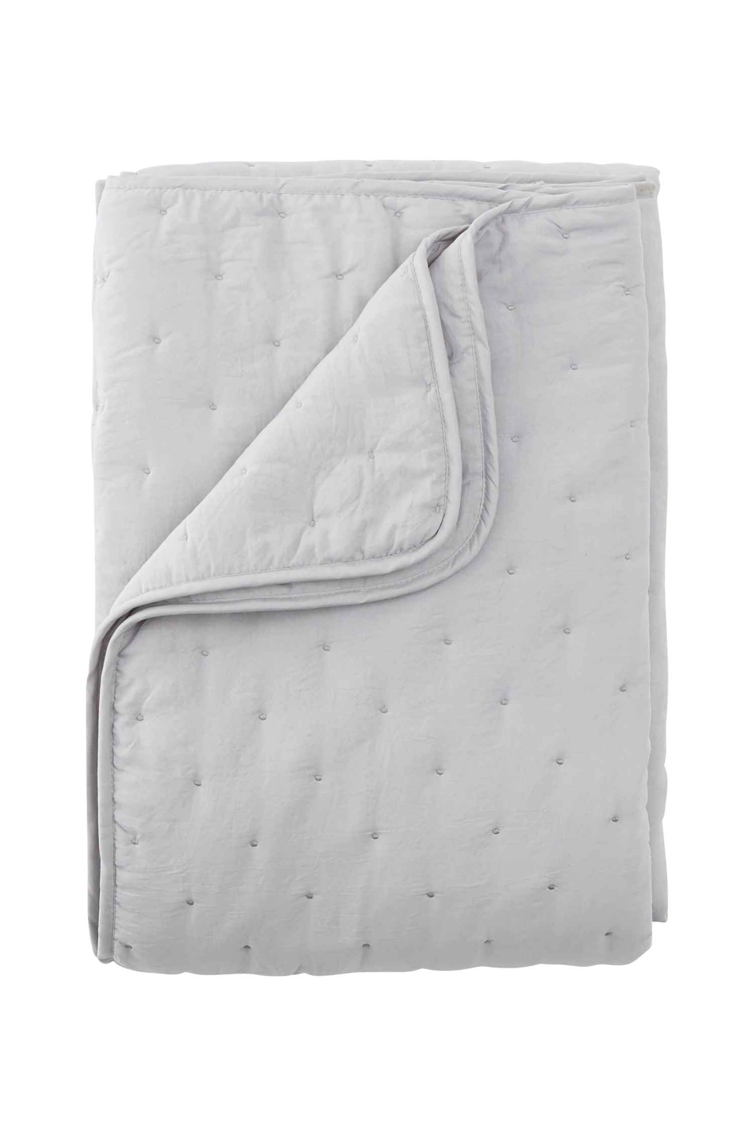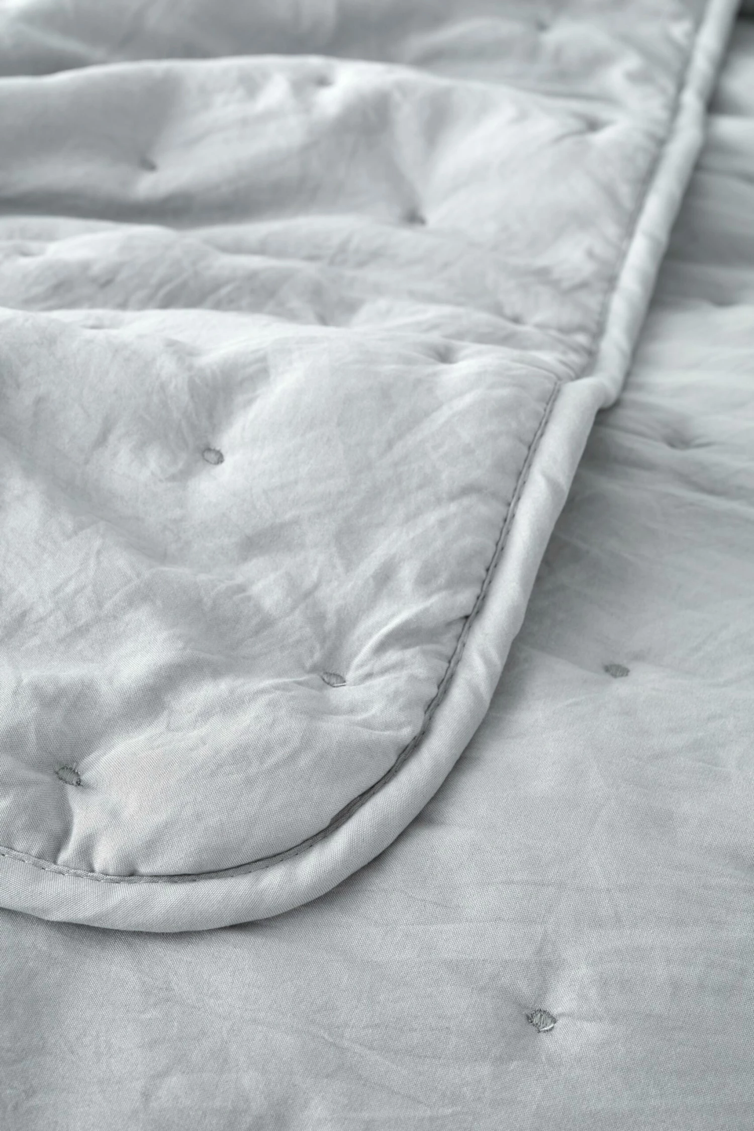 Quiltat överkast i tvättad kvalitet med mjuk, matt yta och broderade prickar på båda sidor.