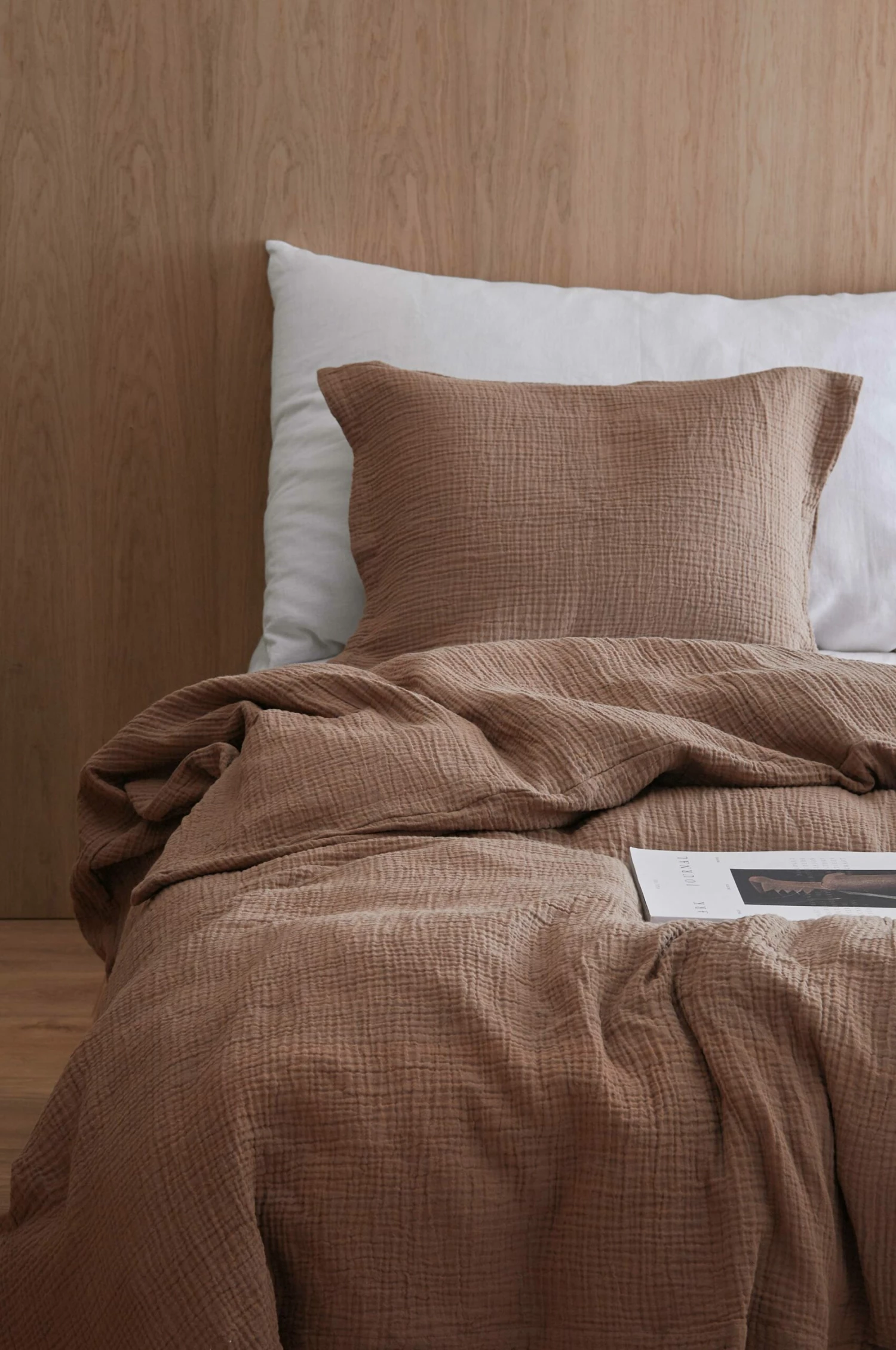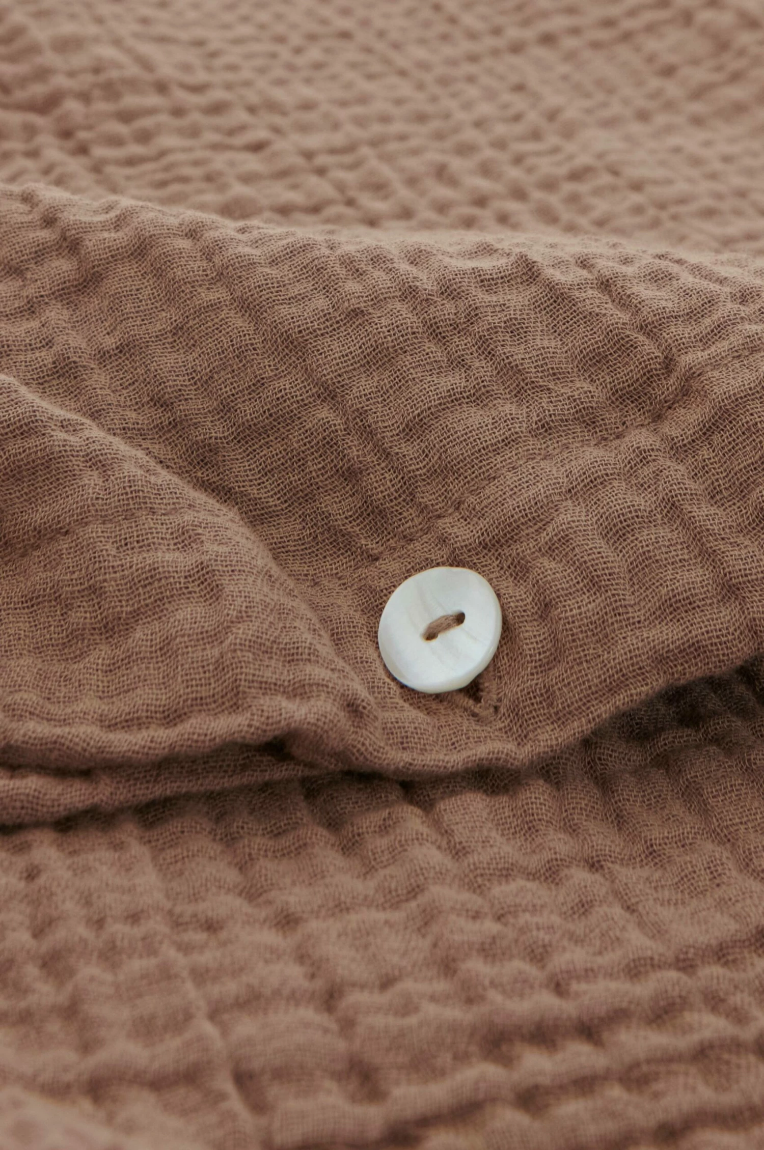 2- eller 3-dels påslakanset av tvättad, ekologisk bomullsmuslin i 2 lager. Påslakanet har knappar i nederkanten. Örngottet har 2,5 cm vinge runt om. Setet levereras rullat.