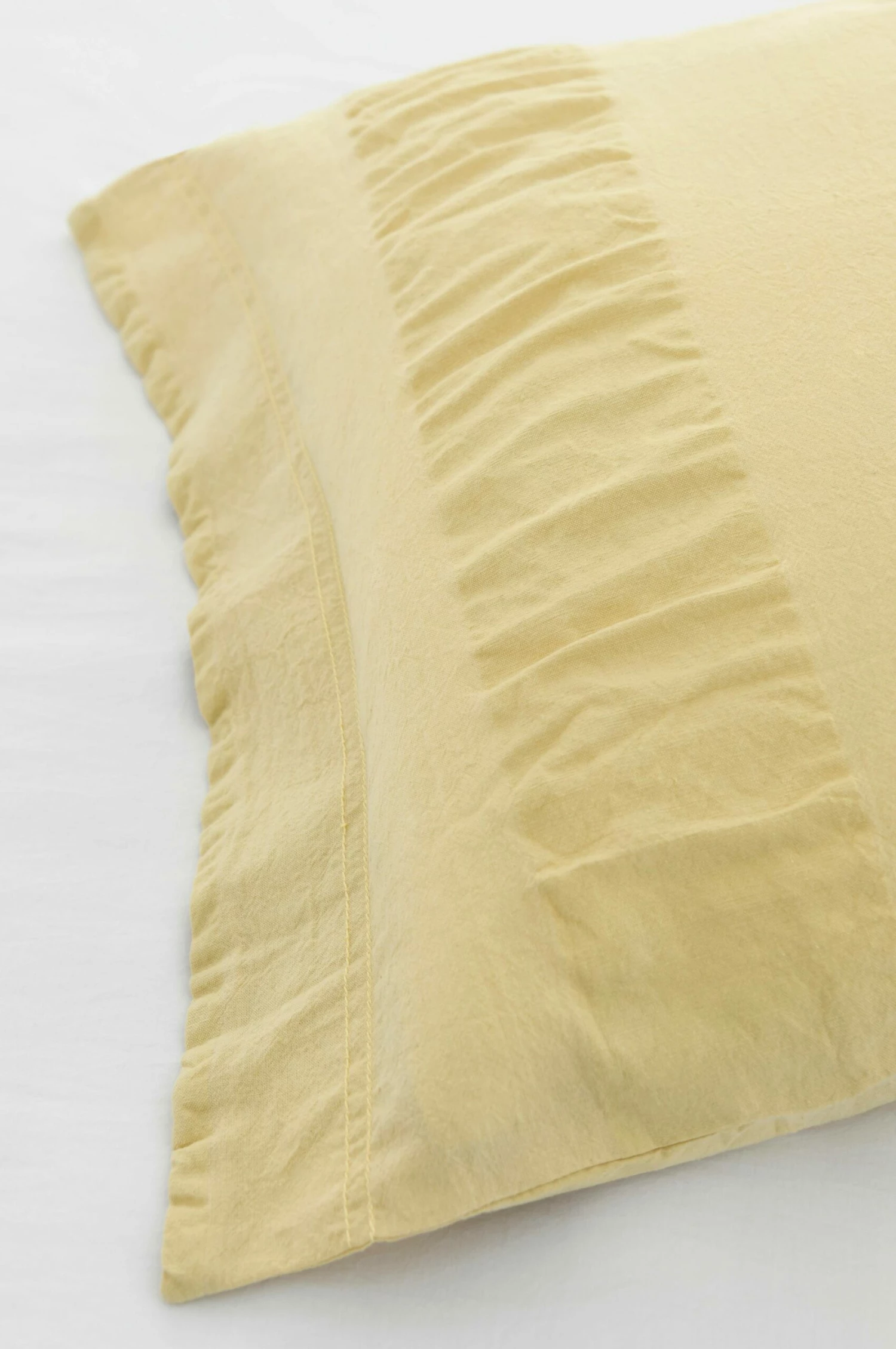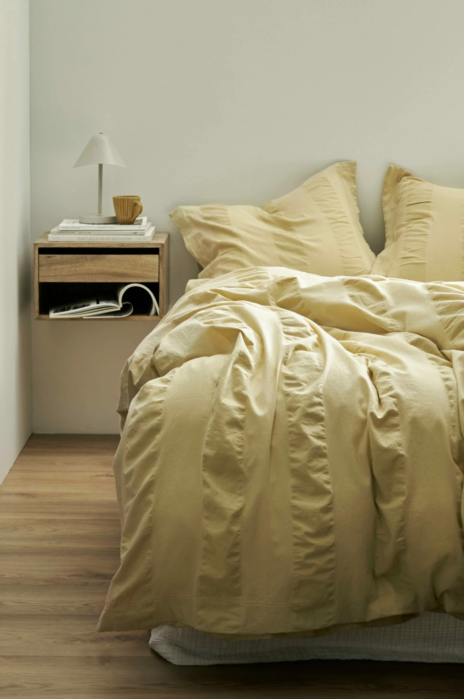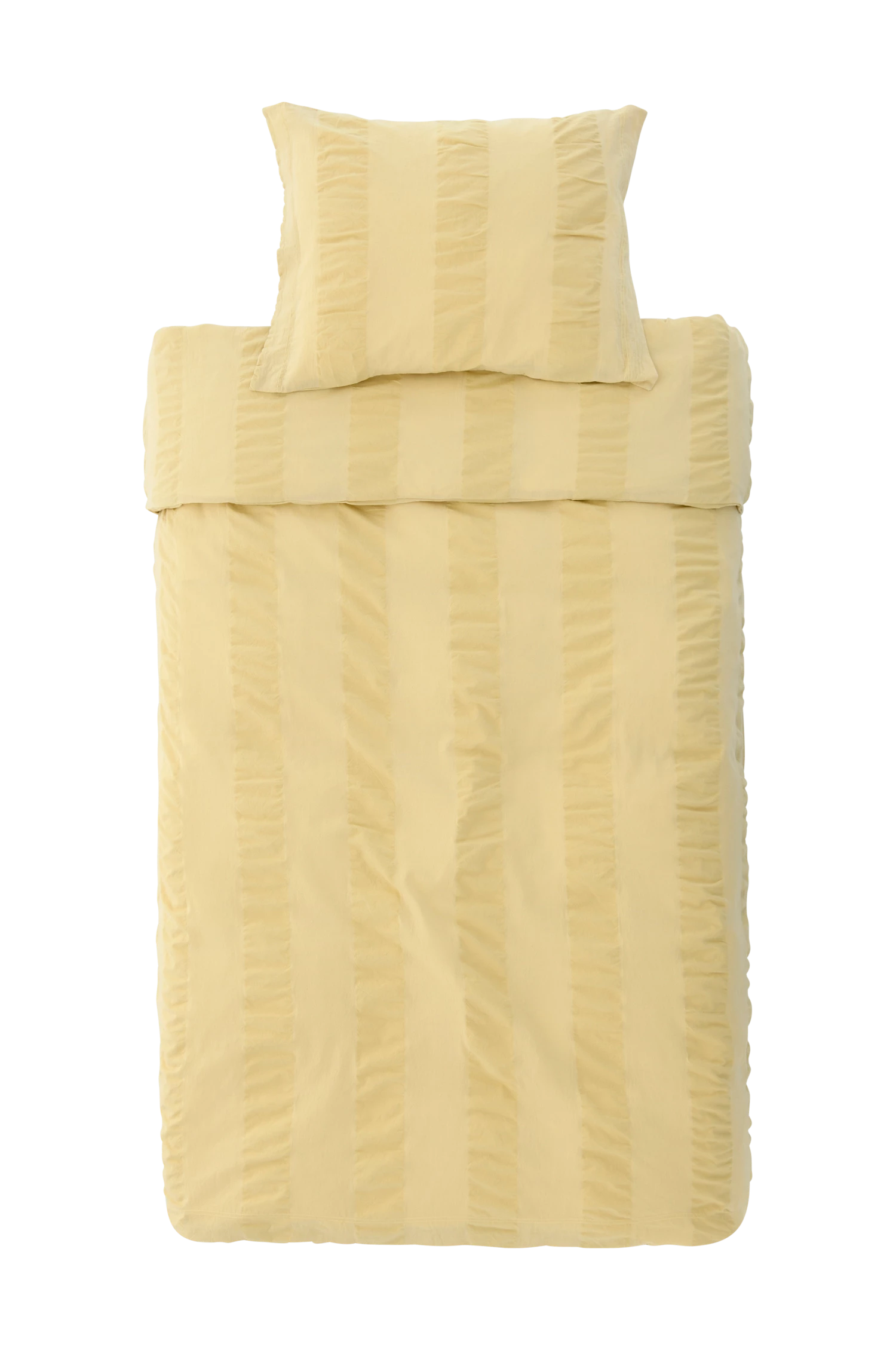 Påslakanset i seersucker (bäckebölja) med breda ränder i klassiskt strukturmönster. Av tvättad ekologisk bomull. Trådtäthet 144 tc. Tryckknappar i nederkanten på påslakanet. Örngottet har 5 cm vinge på kortsidorna. Påslakan 150×200 cm och örngott 50×60 cm. Levereras i tygbag i samma kvalitet.