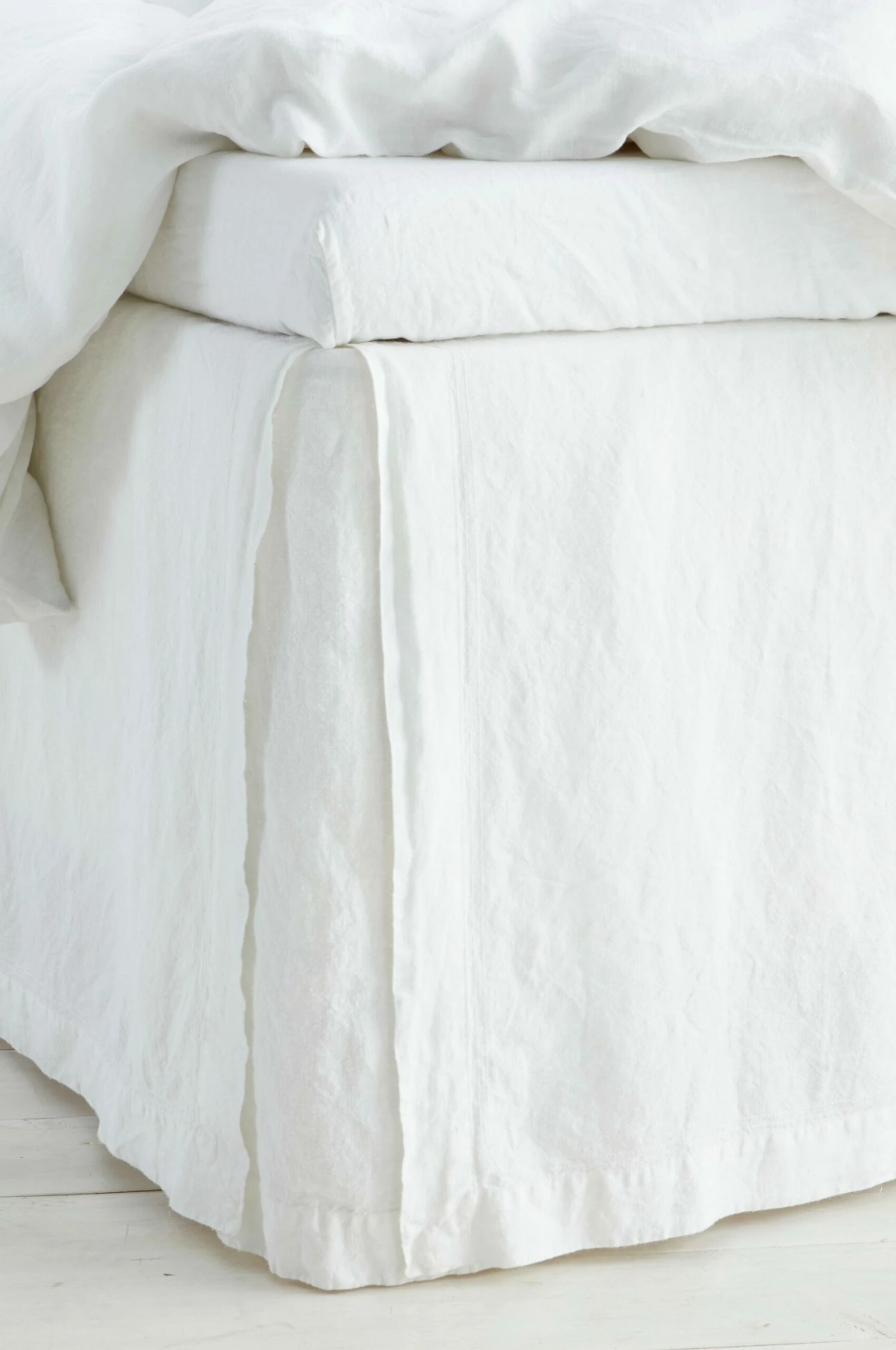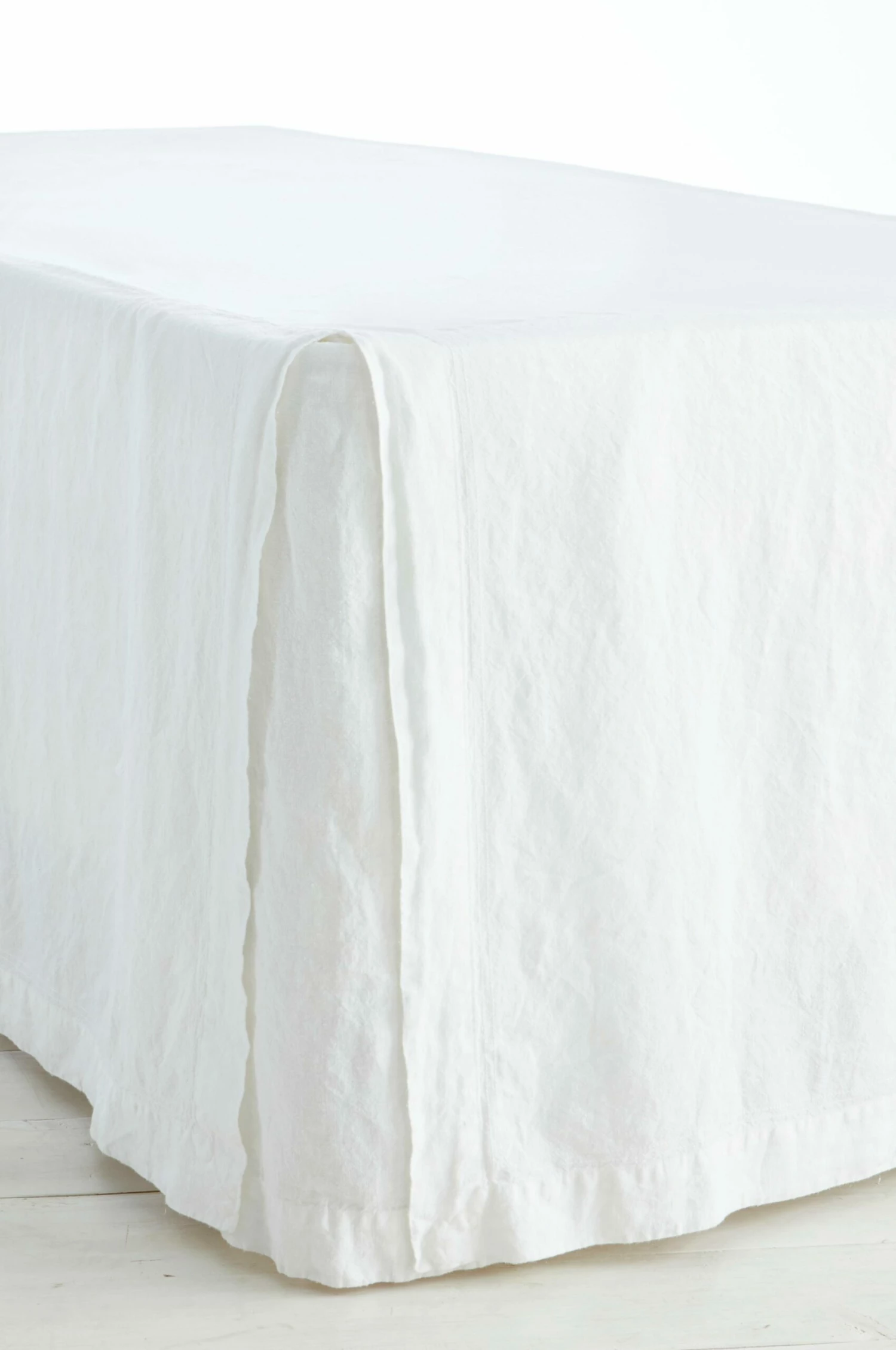 Sängkappa i tvättad och garnfärgad chambray av lin. Platta av tvättad bomull. Öppna hörn. 5 cm dubbel jeanssöm. Kappans höjd 60 cm, passar till kontinentalsäng. Finns i fyra storlekar: 90×200, 120×200, 160×200 och 180×200 cm.