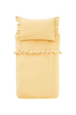 Påslakanset i 2 delar av ekologisk bomull med dekorativ volangkant. Att bädda med bomull är luftigt och mjukt mot kroppen. Påslakansetet passar till spjälsäng. Trådtäthet på 144 tc. (Trådtätheten talar om antalet trådar, thread counts, per kvadrattum i ett tyg. Ju högre trådtäthet desto högre kvalité).