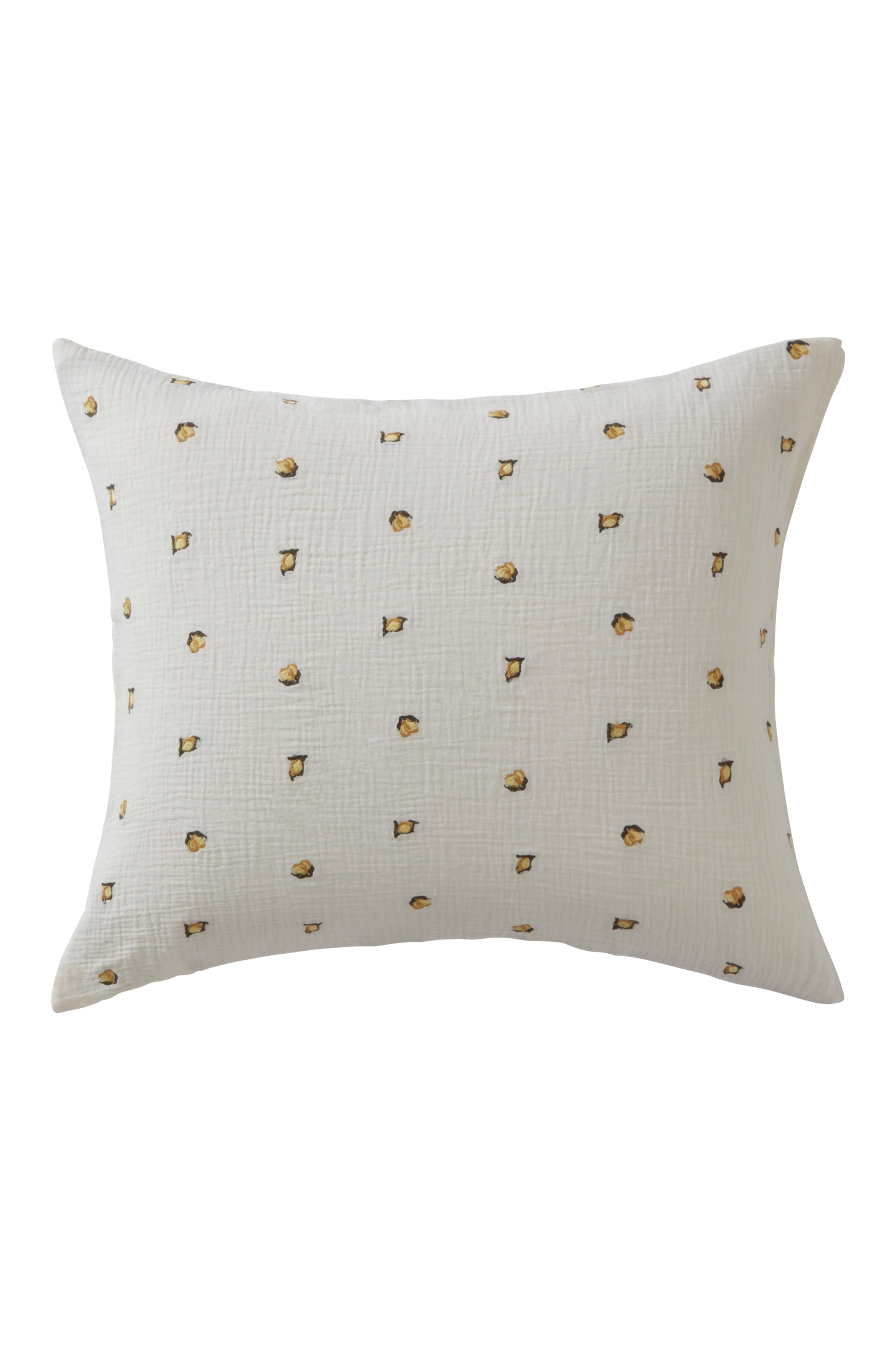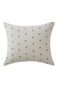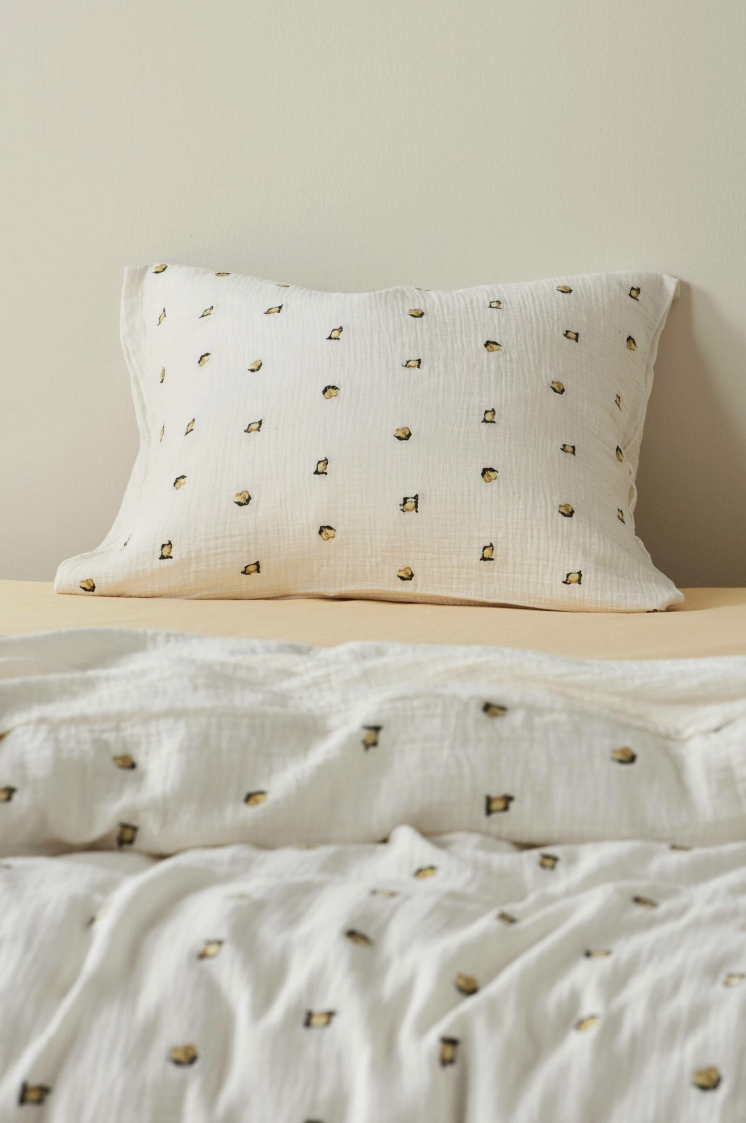 1-pack örngott i härlig, ekologisk bomullsmuslin med broderade små citroner. Muslin är ett mjukt, tunt tyg i två lager, vävt med bubblig effekt, vilket gör tyget mjukt och extra lättskött. Du behöver inte stryka eller mangla. Det behagliga muslintyget är skönt att sova i. Trådtäthet på 178 tc. (Trådtätheten talar om antalet trådar, thread counts, per kvadrattum i ett tyg. Ju högre trådtäthet desto högre kvalité.)