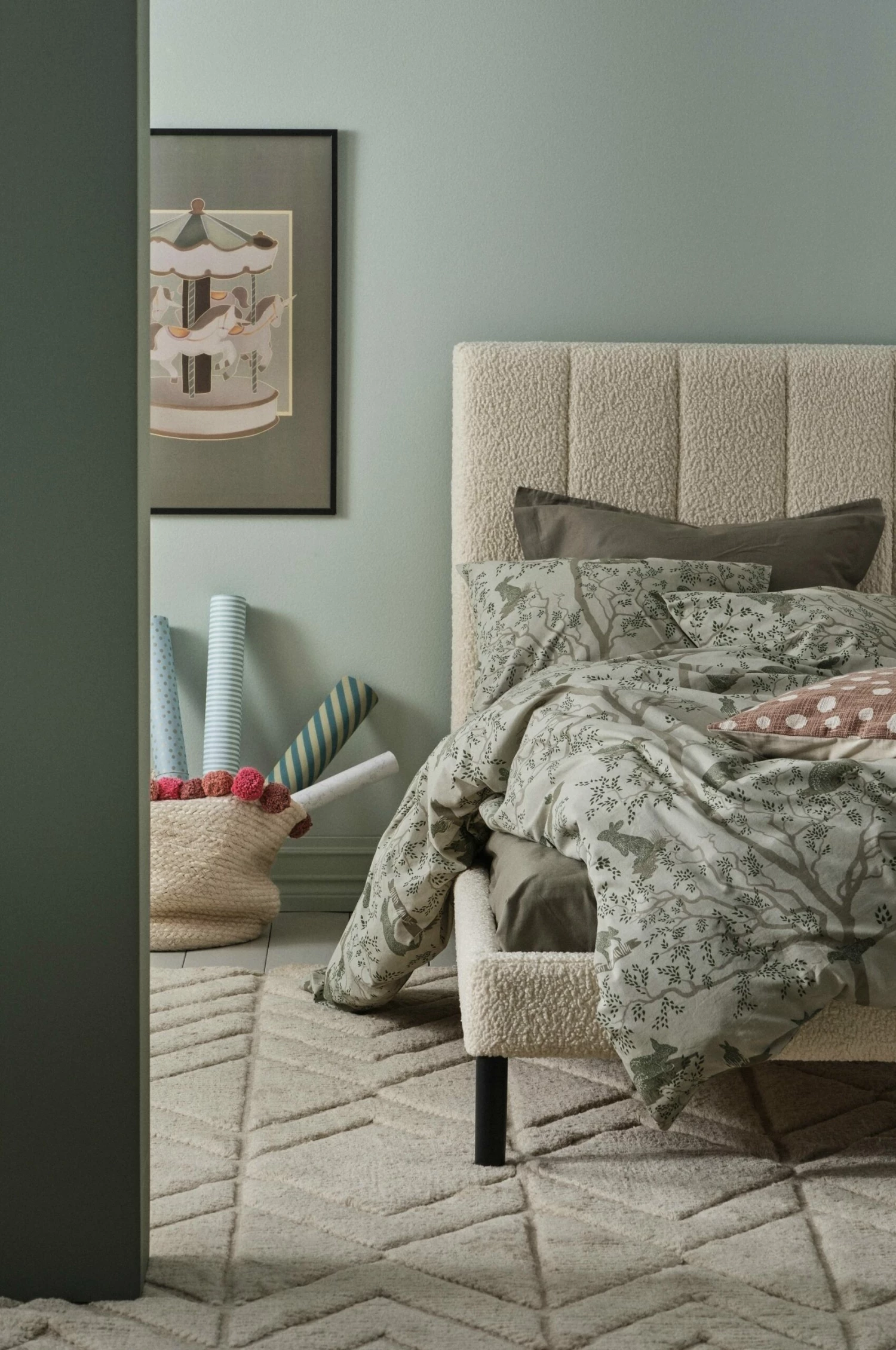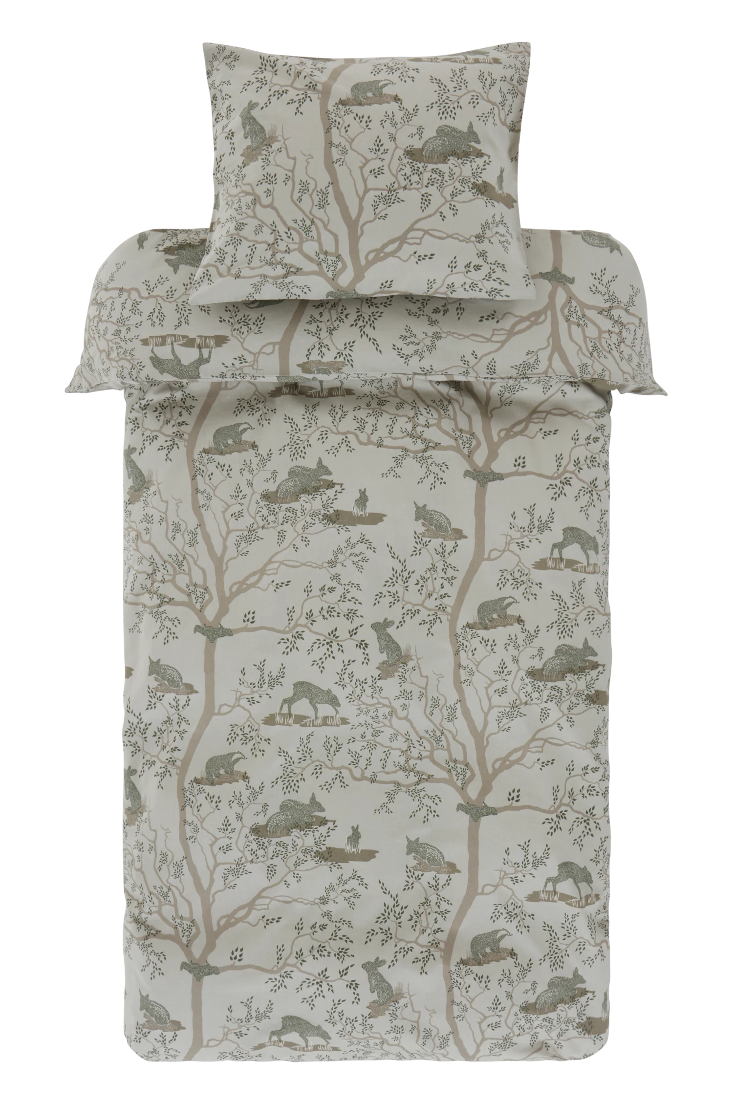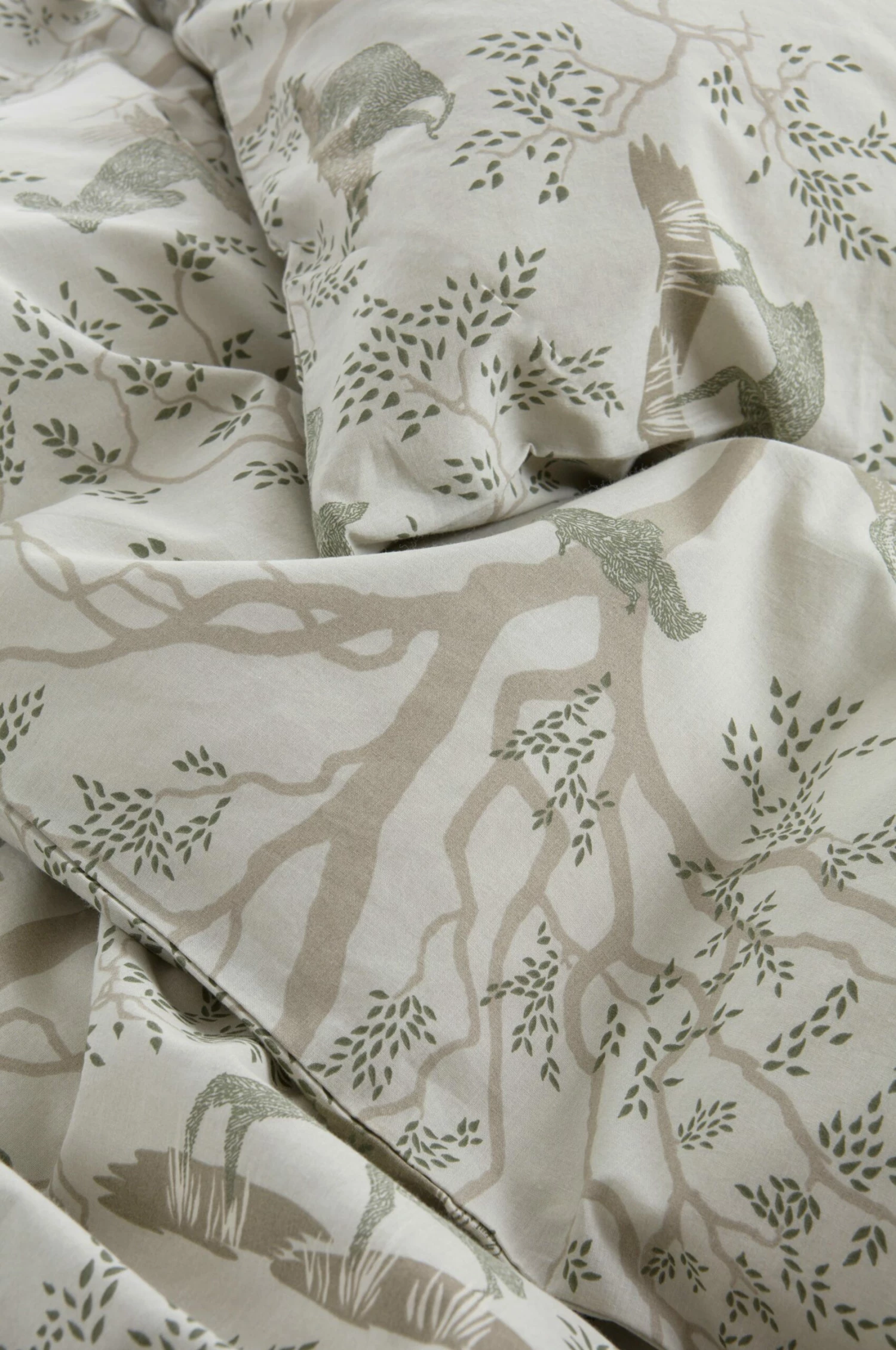Påslakanset i 2 delar i ekologisk bomull med tryckt mönster. Tyget är enzymtvättat vilket ger en skön, lite sliten känsla. Öppning i övre hörnen på påslakanet. Trådtäthet på 144 tc. (Trådtätheten talar om antalet trådar, thread counts, per kvadrattum i ett tyg. Ju högre trådtäthet desto högre kvalité).
