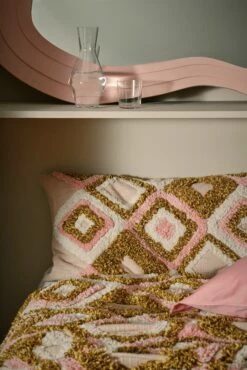 Kuddfodral av bomull i grövre kvalitet med tuftat mönster på framsidan. Enfärgad baksida. Metalldragkedja.
