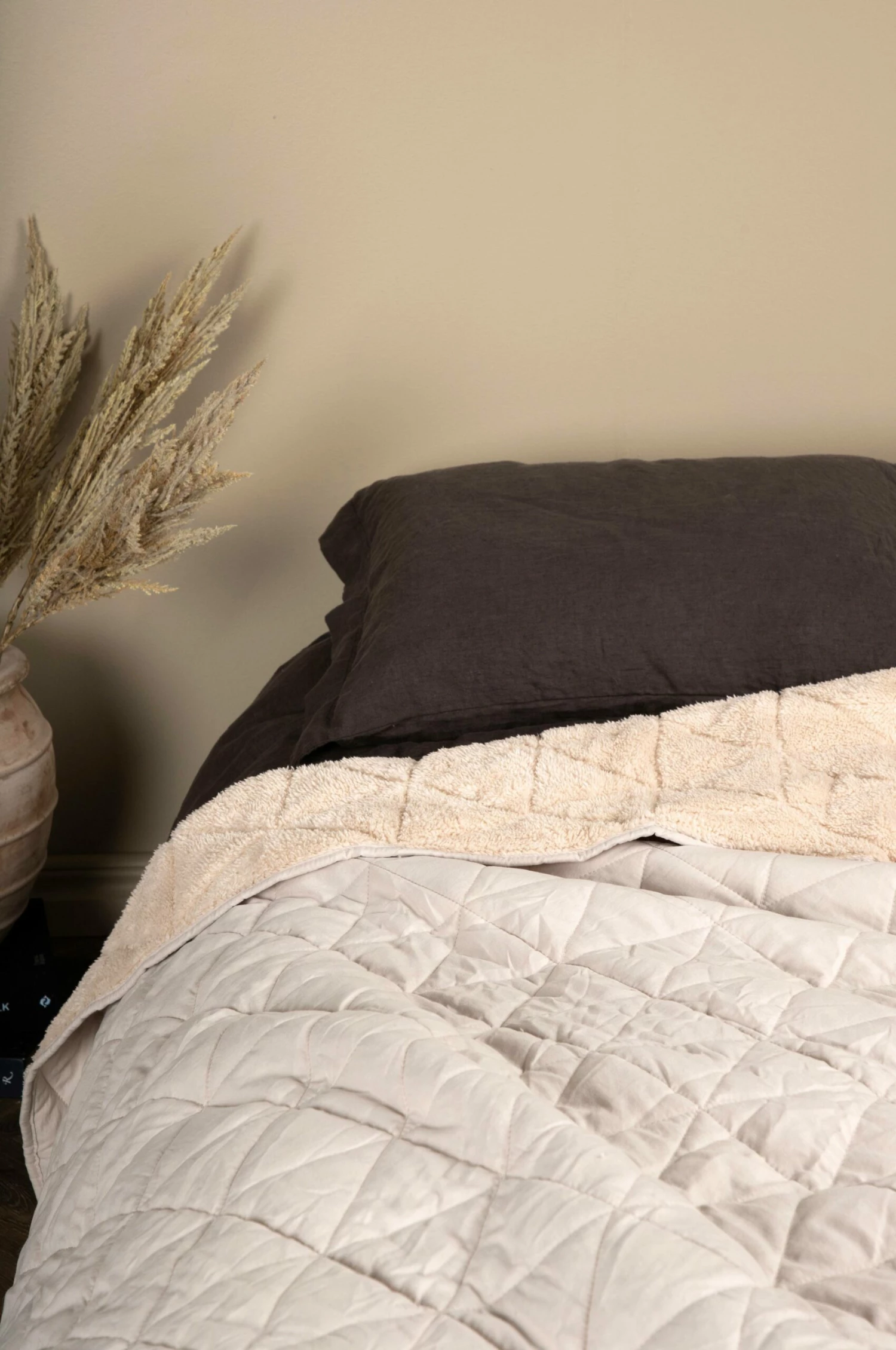 Nilla överkast är tillverkat med två sidor i olika tyger och passar pefekt för dig som vill ändra om i sovrummet med jämna mellanrum! Ena sidan av överkastet är klassiskt enkelt quiltat tyg som ger et städat och harmoniskt intryck. Andra sidan är tillverat i mjukt och skönt sherpa som ger den där mysiga känslan till rummet. Bädda med överkastet på ena eller andra sidan för en enhetlig karraktär, eller vik upp i ovankant för att kombinera de två tygen i en härlig mix av material i bäddningen!